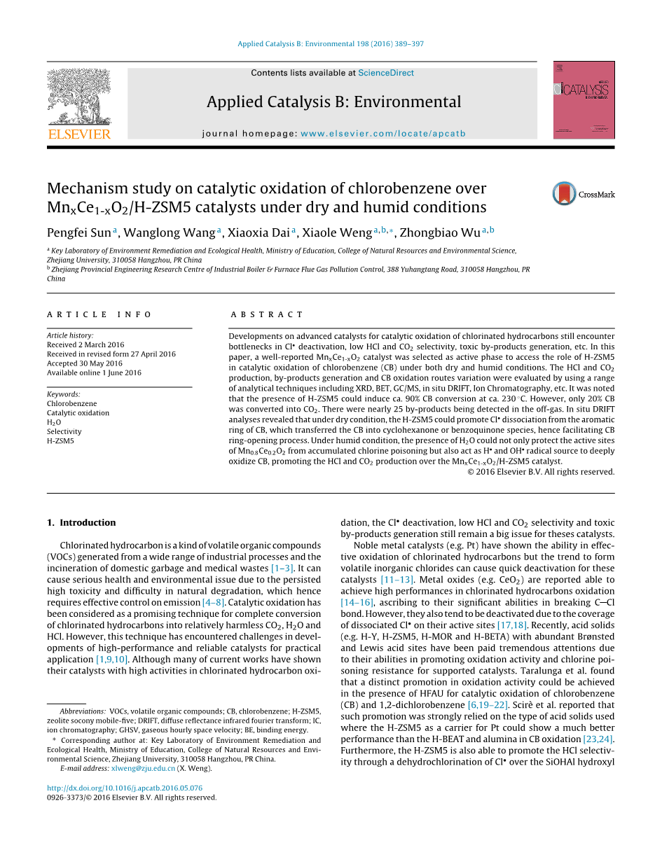 关键词:氯苯;催化氧化;H2O;选择性;H-ZSM5