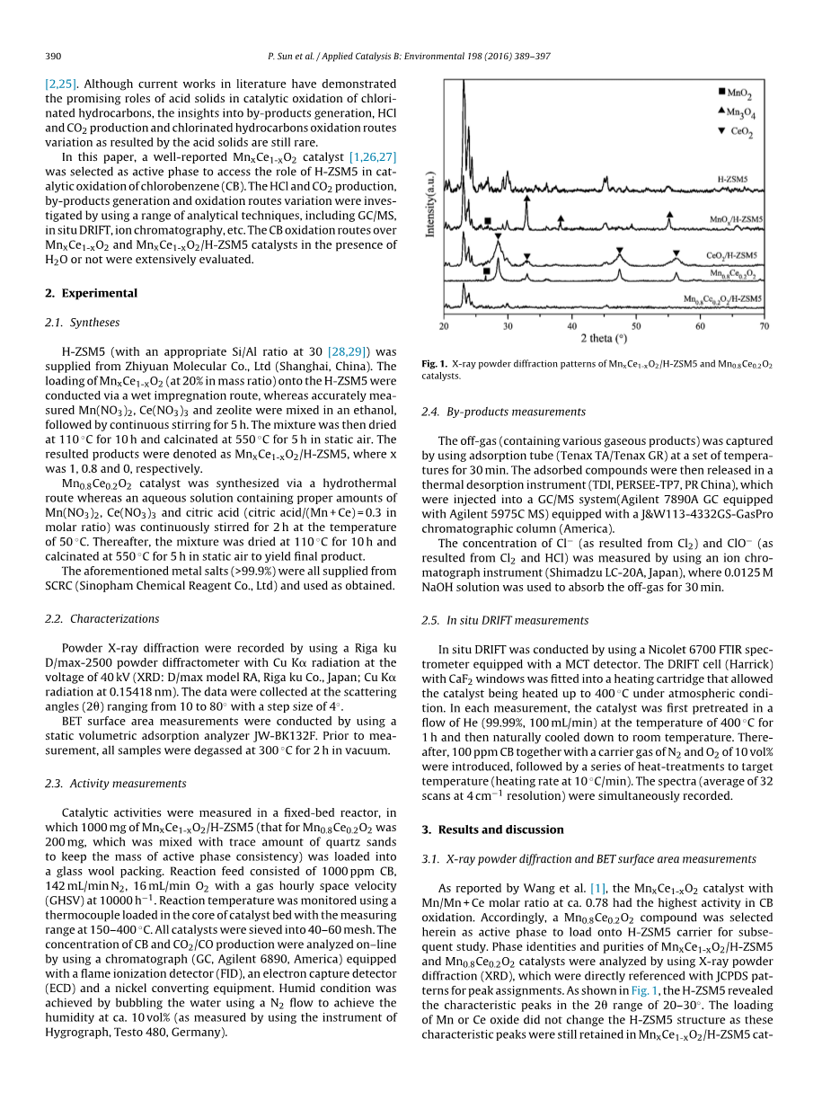 氯代烃是一种由各种工业过程,焚烧生活垃圾和医疗废物产生的挥发性有机化合物(VOCs)[1–3].由于自然降解持续存在的高毒性和不稳定性,会导致严重的健康和环境问题,因此需要有效控制排放[4–8].催化氧化被认为是将氯代烃完全转化为相对无害的CO2,H2O和HCl的有前景的技术。然而,这种技术在实际应用的高性能和可靠催化剂的开发中遇到了挑战[1,9,10].虽然目前许多工作已经显示出它们在氯化烃氧化物中具有高活性的催化剂,Clbull;失活,低HCl和CO2选择性以及有毒副产物生成仍然是这些催化剂的主要问题。贵金属催化剂(例如Pt)已显示出有效氧化氯代烃的能力,但形成挥发性无机氯化物的趋势可导致这些催化剂的快速失活[11–13].据报道,金属氧化物(例如CeO2)能够在氯化烃氧化过程中实现高性能[14–16],在于它们破坏了C-Cl键。然而,由于其活性位点上的解离Clbull;的覆盖,它们也倾向于失活[17,18].最近,具有丰富的布朗斯泰德和路易斯酸位点的酸固体(例如HY,H-ZSM5,H-MOR和H-BETA)由于其促进负载型催化剂的氧化活性和抗氯中毒性的能力而受到极大的关注。Taralunga等人发现在HFAU存在下可以实现氧化活性的明显提高,用于催化氧化氯苯(CB)和1,2-二氯苯[6,19–22]. Sciregrave;等人报道,这种强促进作用依赖于所使用的酸固体的类型,其中H-ZSM5作为Pt的载体在CB氧化中可表现出比H-BEAT和氧化铝更好的性能[23,24].此外,H-ZSM5还能够通过Clbull;的脱氯化氢反应在SiOHAl羟基上促进HCl选择性[2,25].尽管目前文献中的工作已经证明了酸固体在氯代烃的催化氧化方面的巨大作用,但由于酸固体产生的副产物产生,HCl和CO2产生以及氯代烃氧化途径变化的见解仍然很少见。本文报道了一种报道广泛的MnxCe1-xO2催化剂[1,26,27]被选作活性相以获得H-ZSM5在氯苯(CB)的催化氧化中的作用。采用一系列分析技术,包括GC / MS,原位DRIFT,离子色谱等,研究了HCl和CO2的产生,副产物产生和氧化途径的变化.CB氧化途径MnxCe1-xO2和MnxCe1-xO2/ H-ZSM5催化剂在H2O或不存在情况下进行了广泛的评估。