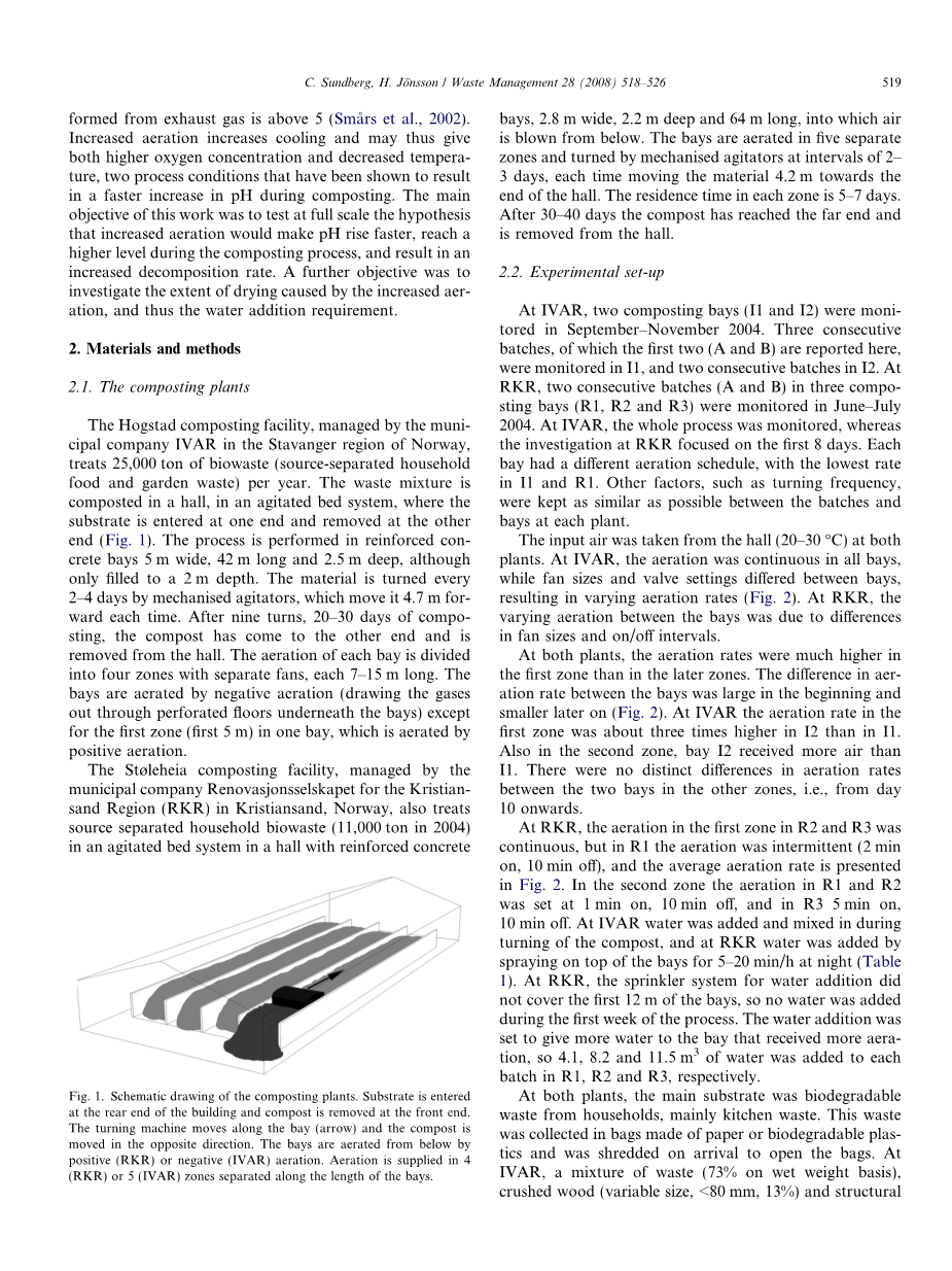 在挪威斯塔万格地区,市政府公司IVAR使用Hogstad堆肥设施,每年处理25000吨生活垃圾(源分离的厨余垃圾和园林废弃物)。垃圾混合物在一个堆肥仓的搅拌器里堆肥,原料从一端进入向另一端移动(图1)。这个过程是在一个5米宽,42米长,2.5米高的钢筋混凝土托架中进行的,虽然只填充到一个2米的高度。原料每2-4天被机械搅拌器推进4.7米,经过9轮,20-30天的堆肥,堆肥已经到了另一端,并从堆肥仓里出来。每个隔间的通气被分为四个单独的区域,每个7-15米长。这些隔间的曝气的负曝气(气体通过隔间底部的多孔板出去),除了隔间的第一个区域(第一个5米)是正曝气。