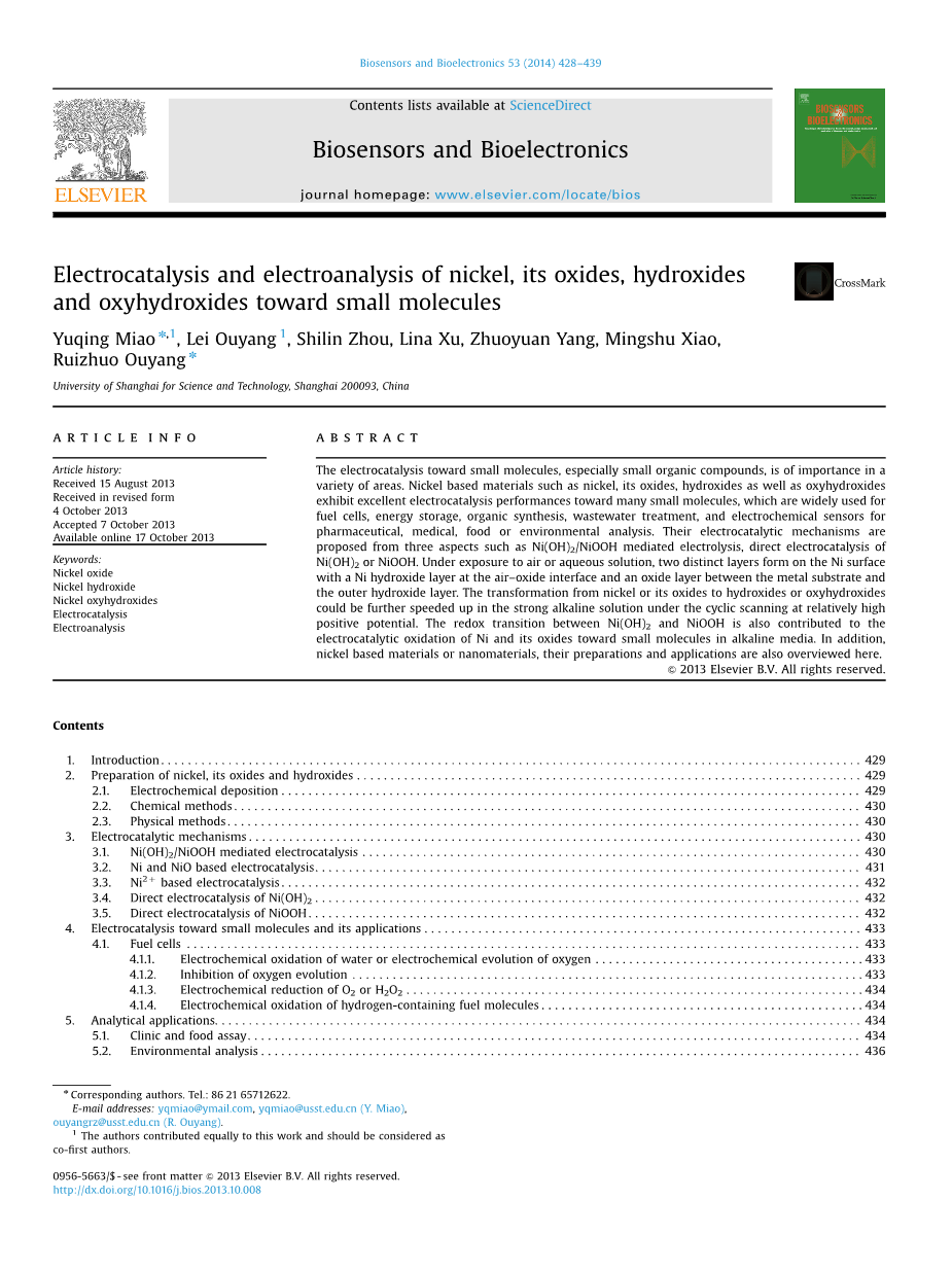 此外,并不是所有对有机小分子化合物的电催化作用都是基于氧化还原电对介导电催化机制。有时,一些小分子有机化合物的直接电催化作用发生在Ni(OH)2 or NiOOH (Hutton et al.,