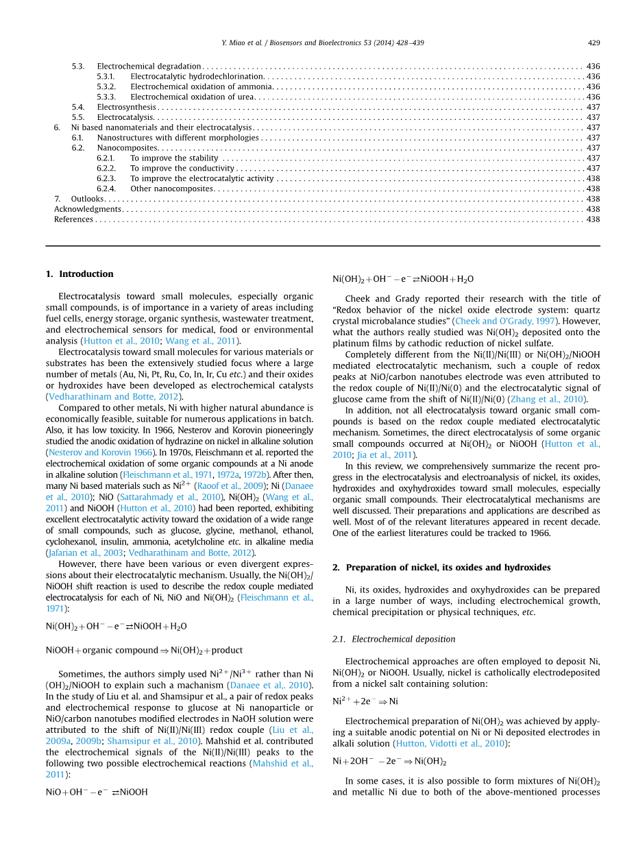 在Ni(OH)2和NiOOH之间的这样一个氧化还原过度也被用来描述Ni(OH)2在碱性电解液中对有机小分子的电催化氧化机