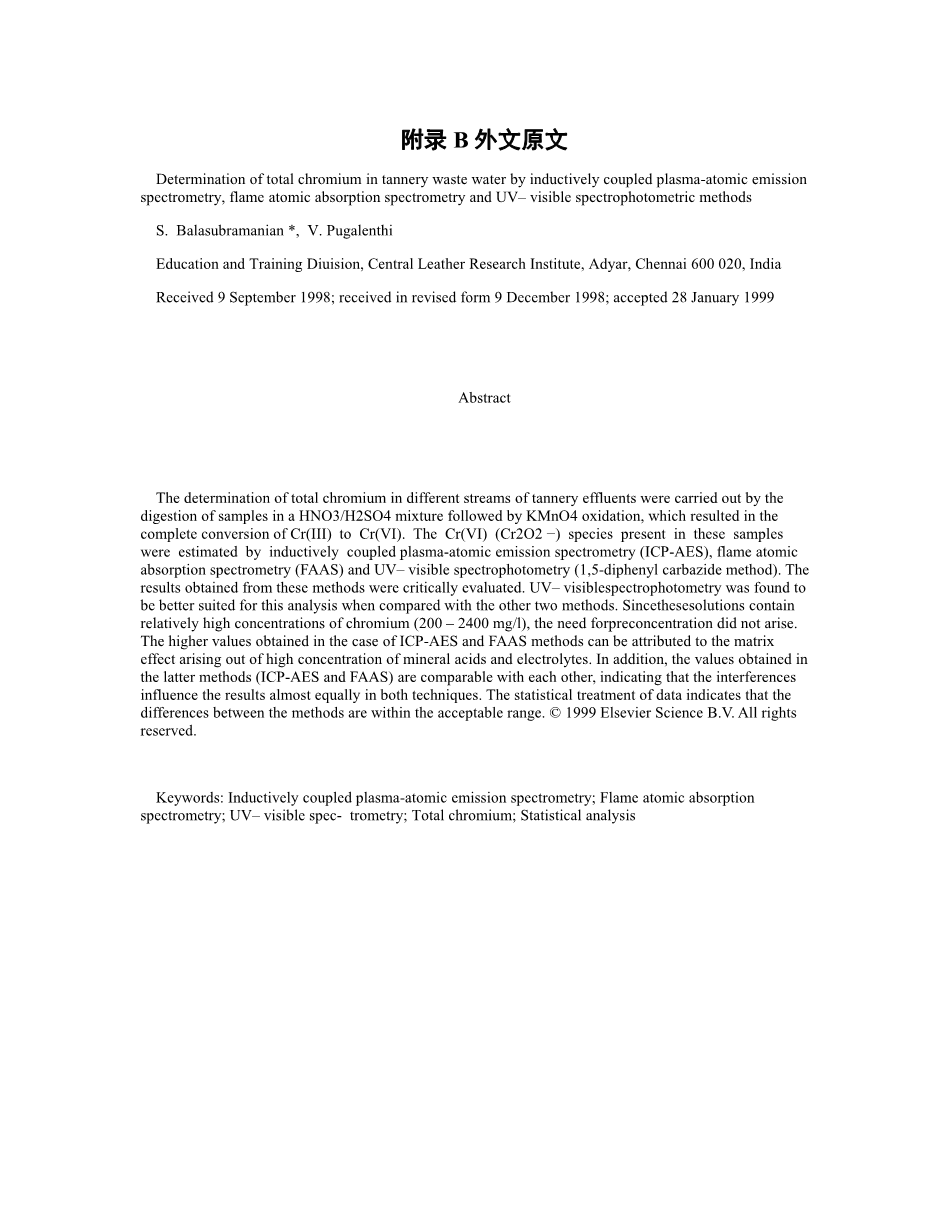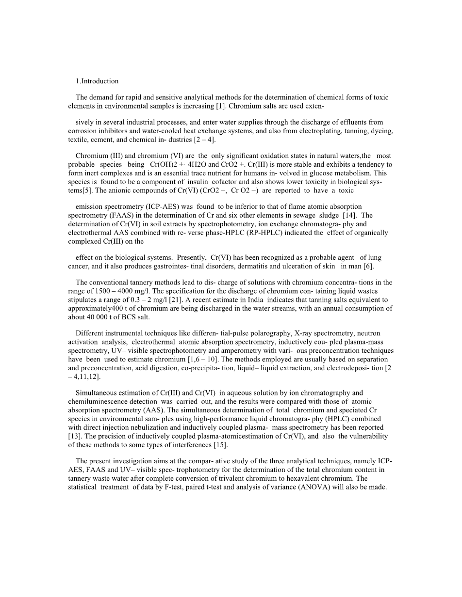 传统的制革方法导致铬浓度范围为1500- 4000mg / l的溶液的排出。含铬液体废物排放规范规定的范围为0.3 - 2 mg / l [21]。印度最近的一项估计表明,鞣制盐相当于约在水流中排放400吨铬,每年消耗大约40 000吨BCS盐。不同的仪器技术如差分脉冲极谱法,X射线光谱法,中子活化分析,电热原子吸收光谱法, 电感耦合等离子体质谱法,紫外 - 可见分光光度法和各种预浓缩技术的安培法已被用于估算铬[1,6] - 10]。采用的方法通常基于分离和预浓缩,酸消解,共沉淀,液 - 液萃取和电沉积[2 - 4,11,12]。通过离子色谱和化学发光检测同时估算水溶液中的Cr(III)和Cr(VI),并将结果与原子吸收光谱法(AAS)进行比较。报道了使用高效液相色谱(HPLC)结合直接喷雾雾化和电感耦合等离子体质谱法同时测定环境样品中的总铬和特定Cr物种[13]。电感耦合等离子体原子的精度估计Cr(VI),以及这些方法对某些类型干扰的脆弱性[15]。