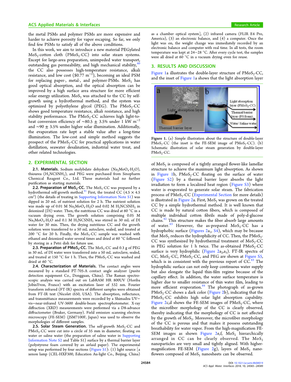 图la展示了PMoS2-CC的双层结构,其插图显示了MoS2光吸收层是由紧密排列的花状片层结构组成,以实现对光的最大吸收。如图1b所示,PMoS2-CC漂浮在水面上(图S2),通过一个热障层吸收光的照射,形成一个局域热区(图S3),在这个局域热区中,水蒸发生成太阳能蒸汽。PMoS2-CC (详见实验部分)的制作过程如图2a所示。首先,用简单的水热法在处理过的CC上生长MoS2。众所周知,CC是由天然棉纤维制成的,它是由多个由聚d-葡萄糖链组成的单根棉纤维组成。这种结构使纤维吸收大量的水。然而,制备的MoS2-CC具有疏水表面(图2a1, S4),这可能是因为MoS2降低了CC的亲水性,然后在PEG溶液中对MoS2-CC进行水热处理1小时,两次后合成了PMoS2-CC。得到的PMoS2-CC2表面非常亲水(图2a2 a3)。CC、MoS2-CC、PMoS2-CC和PEG的FT-IR光谱如图Ss所示,这与之前CC的报告相一致,亲水表面不仅可以保持连续的供水,而且由于毛细管作用使液膜状态延长。此外,由于薄水膜阻力较小,使得水面温度较高,蒸发效率较高。生长的PMoS2-CCC的照片为黑色(图2b),说明PMoS2-CC具有较高的太阳能吸收能力。图2 c, d显示了PMoS2-CC的FE-SEM图像,显然是观察到的棉布的超细纤维形态从而表明棉布的形态是不受MoS2结构的增长。此外,超细纤维形态的CC是多孔性,使其拥有出色的透气性为水蒸气逸散提供条件。从高倍放大FE-SEM图像如图2e,f,MoS2分层排列在CC中,且可以清晰的被观察到。MoS2纳米粒子非常小,排列紧密。利用高倍FE-SEM(图2g)可以观察到由MoS2纳米片组成的MoS2纳米花层。