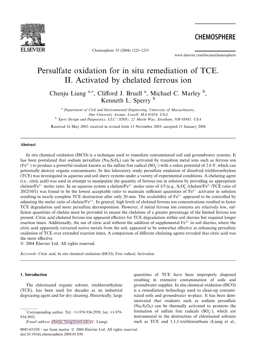 氯化有机溶剂三氯乙烯(TCE)已被用作工业脱脂剂和干洗数十年。历史上,大量TCE被不当处置,导致土壤和地下水供应受到广泛污染。原位化学氧化(ISCO)是一种用于就地清除污染土壤和地下水的修复技术。据证明,过硫酸钠(Na2S2O8)等氧化剂可以热活化以促进硫酸盐自由基(SO4-·)的形成,这有助于破坏氯化溶剂,如TCE和1,1,1-三氯乙烷(Liang等人,2003)。硫酸根自由基(具有氧化还原电位E0(S2O82-/2SO42-)= 2.6V)(Eberson,1987)是一种比过硫酸根阴离子更具侵蚀性的氧化剂(E0(S2O82-/2SO42-)= 2.01V)(Latimer,1952)。