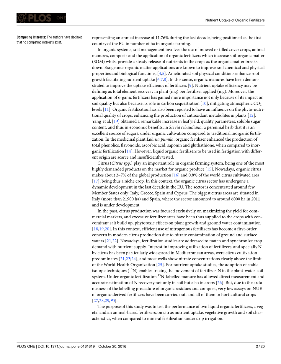在过去,柑橘生产完全集中于最大限度地提高商业市场的产量,因此向作物提供了过量的肥料,伴随而来的是盐的积累、对植物生长的植物毒性作用和地下水污染[18,19,20]。在这方面,因为地下水和地表水的硝酸盐污染,有效使用氮肥已成为现代柑橘生产中的首要关注点(21、22)。如今,施肥研究的目的是使作物需求与营养供应相匹配。地中海地区广大柑橘种植者们对肥料,尤其是氮肥的高效利用十分有兴趣,但大多数井的硝酸盐浓度都明显高于世界卫生组织规定的上限[21,23,24,25]。对于养分摄取的研究,采用稳定剂同位素技术()能够跟踪肥料中的氮在植物-水土壤中的运动系统。在有机施肥条件下,标记的肥料允许在植物和土壤中直接测定和准确估计氮的回收率[26]。但是,由于有机残留物和堆肥的标签程序的复杂性,对有机肥的氮肥利用率检测很少,且全部应用于园艺作物中[27,28,29,30]。