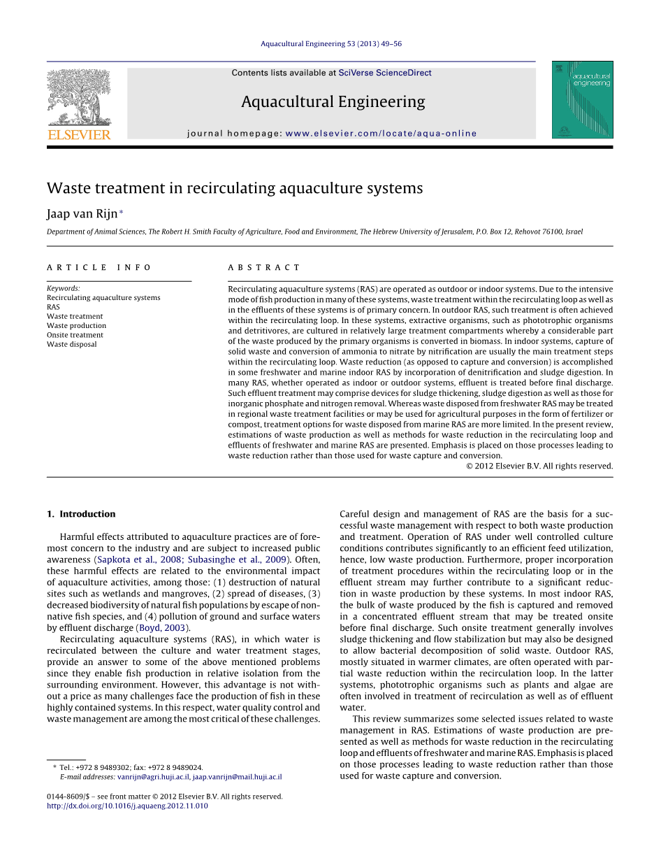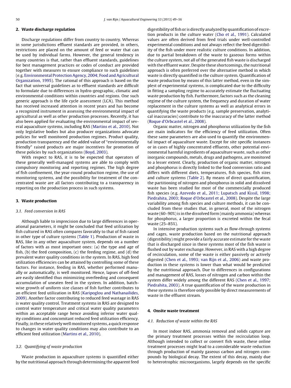 本综述总结了循环水产养殖系统中与废物管理相关的一些选定问题。对淡水和海洋循环水产养殖系统循环回路和废水中的废物产生情况进行了估算,并提出了减少废物的方法。其中的重点放在减少废物的工艺上,而不是用于废物捕获和转化的过程。