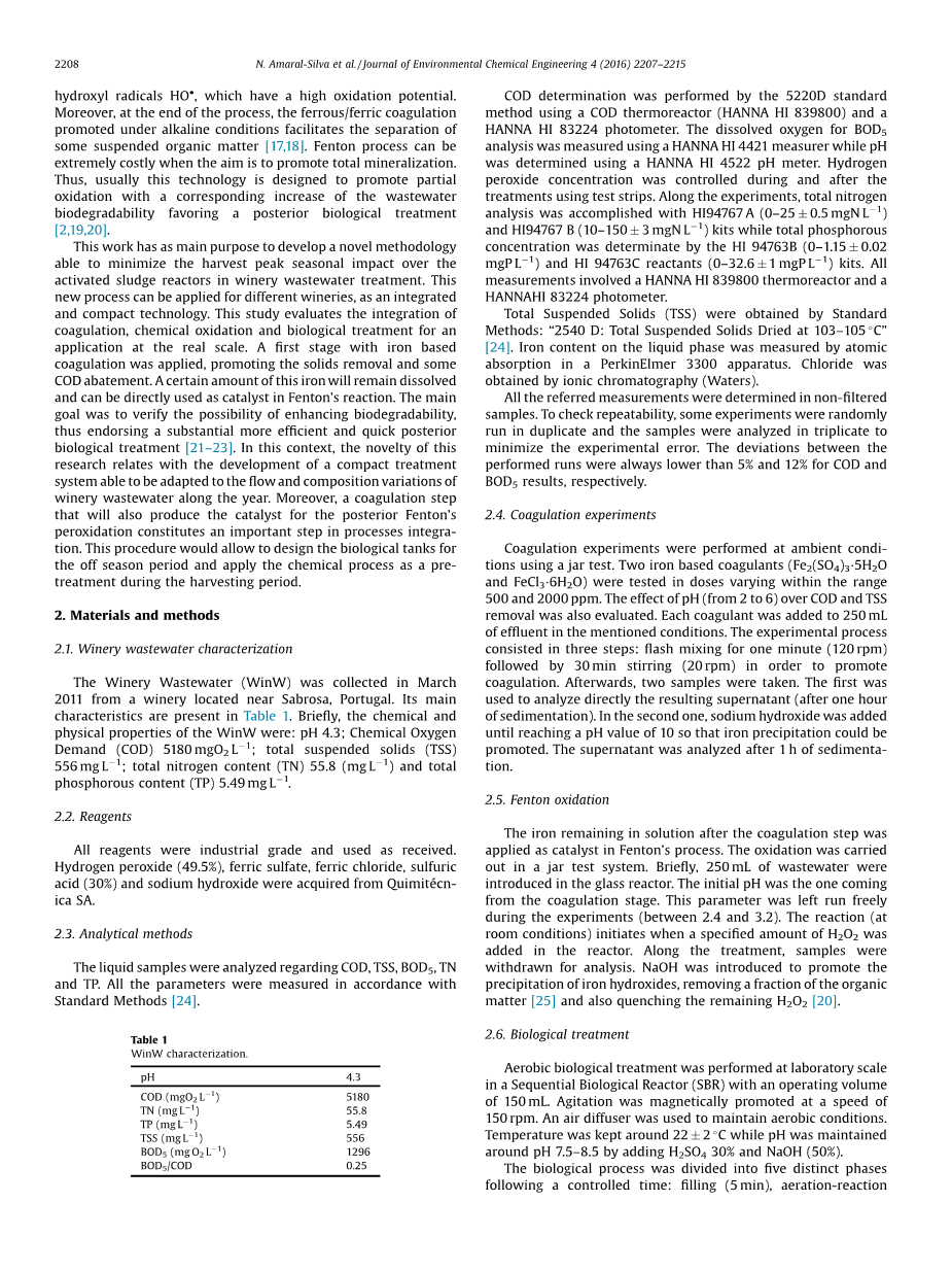 这项工作的主要目的是开发一种新的方法,使酿酒厂废水处理过程中,收获高峰季节对活性污泥反应器的影响最小化。这一新工艺可以作为一种集成、紧凑的技术应用于不同的酿酒厂。本研究评估了混凝、化学氧化和生物处理在实际应用中的整合。第一阶段采用铁基混凝,促进固体去除和部分COD去除。一定量的铁将保持溶解状态,可直接用作芬顿反应的催化剂。主要目的是验证提高生物降解能力的可能性,从而支持更有效和快速的后验生物处理[21-23]。在这种情况下,这项研究的新颖之处在于开发了一个紧凑的处理系统,能够适应一年中酿酒厂废水的流量和成分变化。此外,凝固步骤也将产生后芬顿过氧化反应的催化剂,这是过程整合中的一个重要步骤。该程序将允许在非季节期间设计生物池,并在收割期间应用化学工艺作为预处理。