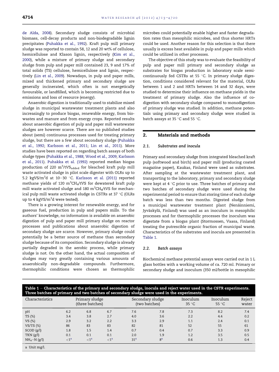 Anaerobic digestion of pulp and paper mill primary sludge and co-digestion of primary and secondary sludge were studied for the first time in semi-continuously fed continuously stirred tank reactors (CSTR) in thermophilic conditions. Additionally, in batch experiments, methane potentials of 210 and 230 m3CH4/t volatile solids (VS)added were obtained for primary, and 50 and 100 m3CH4/tVSadded for secondary sludge at 35 C and 55 C, respec-tively. Anaerobic digestion of primary sludge was shown to be feasible with organic loading rates (OLR) of 1e1.4 kgVS/m3d and hydraulic retention times (HRT) of 16e32 d resulting in methane yields of 190e240 m3CH4/tVSfed. Also the highest tested OLR of 2 kgVS/m3d and the shortest HRT of 14e16 d could be feasible, if pH stability is confirmed. Co-digestion of primary and secondary sludge with an OLR of 1 kgVS/m3d and HRTs of 25e31 d resulted in methane yields of 150e170 m3CH4/tVSfed. In the digestion processes, cellulose and hemi-cellulose degraded while lignin did not. pH adjustment and nitrogen deficiency needs to be considered when planning anaerobic digestion of pulp and paper mill wastewater sludges.