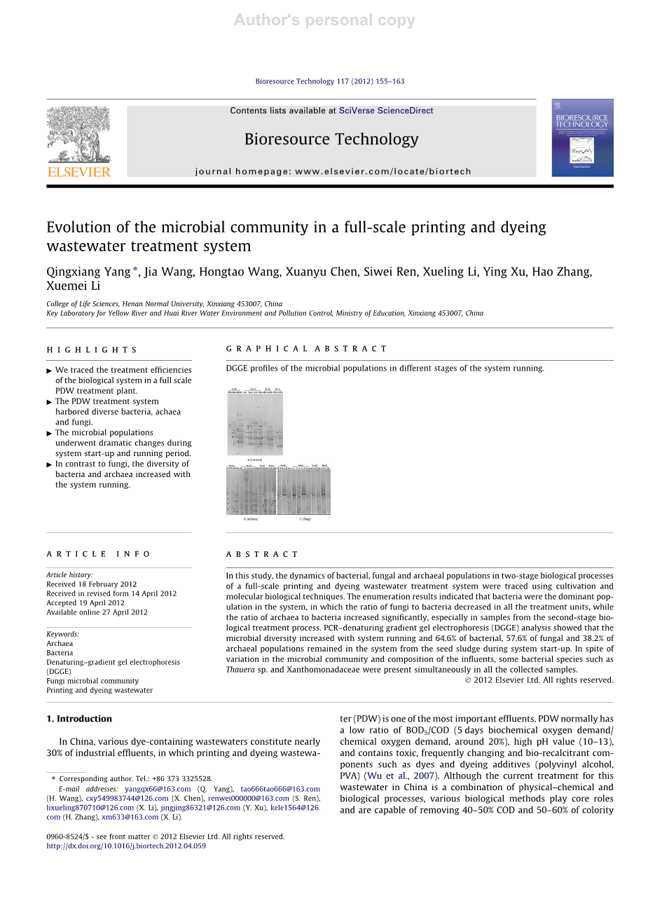 在大多数当前的工业废水处理厂中,通常从市政废水处理厂收集成熟阶段的接种污泥作为接种物。在适应新的废水环境期间,这种污泥经历了微生物群落结构的显着变化,这有时导致系统启动失败。假设主要微生物在系统的每个阶段都发挥着最重要的作用,澄清生物处理过程中的主要微生物组成及其在系统运行中的演化可能有助于理解和解决上述问题。提到的问题。以前许多关于微生物群落动态的研究都集中在功能稳定性和群落稳定性之间的关系,或环境条件对微生物群落结构的影响,以及处理合成废水的实验室规模生物反应器中的关系(Liu等,2011; Hai等,2011)。我们之前关于富含碱性细菌培养物在两个不同的实验室规模反应器中处理真实PDW的能力的研究表明,微生物群落在操作过程中经历了显着的变化而不影响处理效率,并且很少有细菌物种从富集的种子中分离出来的培养物可以在稳定运行的生物反应器中检测到(Yang等,2011)。然而,只有少数研究报道了大规模家庭或工业废水处理系统中的微生物群落动态(Lapara等,2002; Wang等,2011),特别是微生物群落从接种污泥到用于全尺寸PDW处理系统的稳定运行污泥。由于PDW的频繁变化的特征和复杂的组成,PDW处理系统的设计和操作对于理解微生物群落动态与系统启动和稳定运行之间的关系更为重要。本研究采用聚合酶链反应-差热分析(PCR-DGGE)和rRNA基因测序方法,在一套完整的PDW生物处理系统中,对细菌、真菌和古细菌三类微生物的进化过程进行了跟踪研究。本研究结果有望为进一步研究微生物种群在污水处理系统中的作用奠定基础。