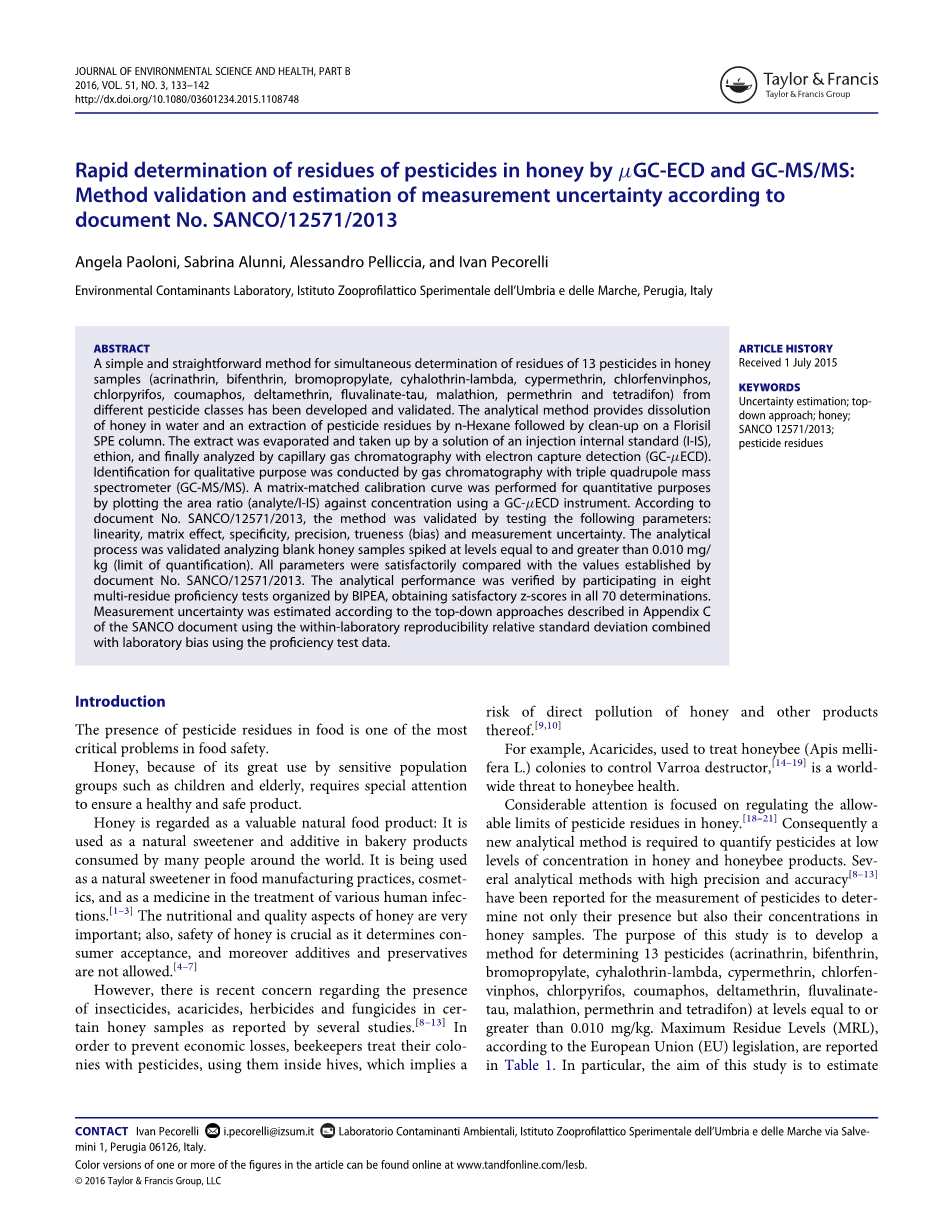 利用GC-ECD和GC-MS/MS快速测定蜂蜜中农药残留量: 根据No. SANCO/12571/2013进行方法验证和不确定度估算