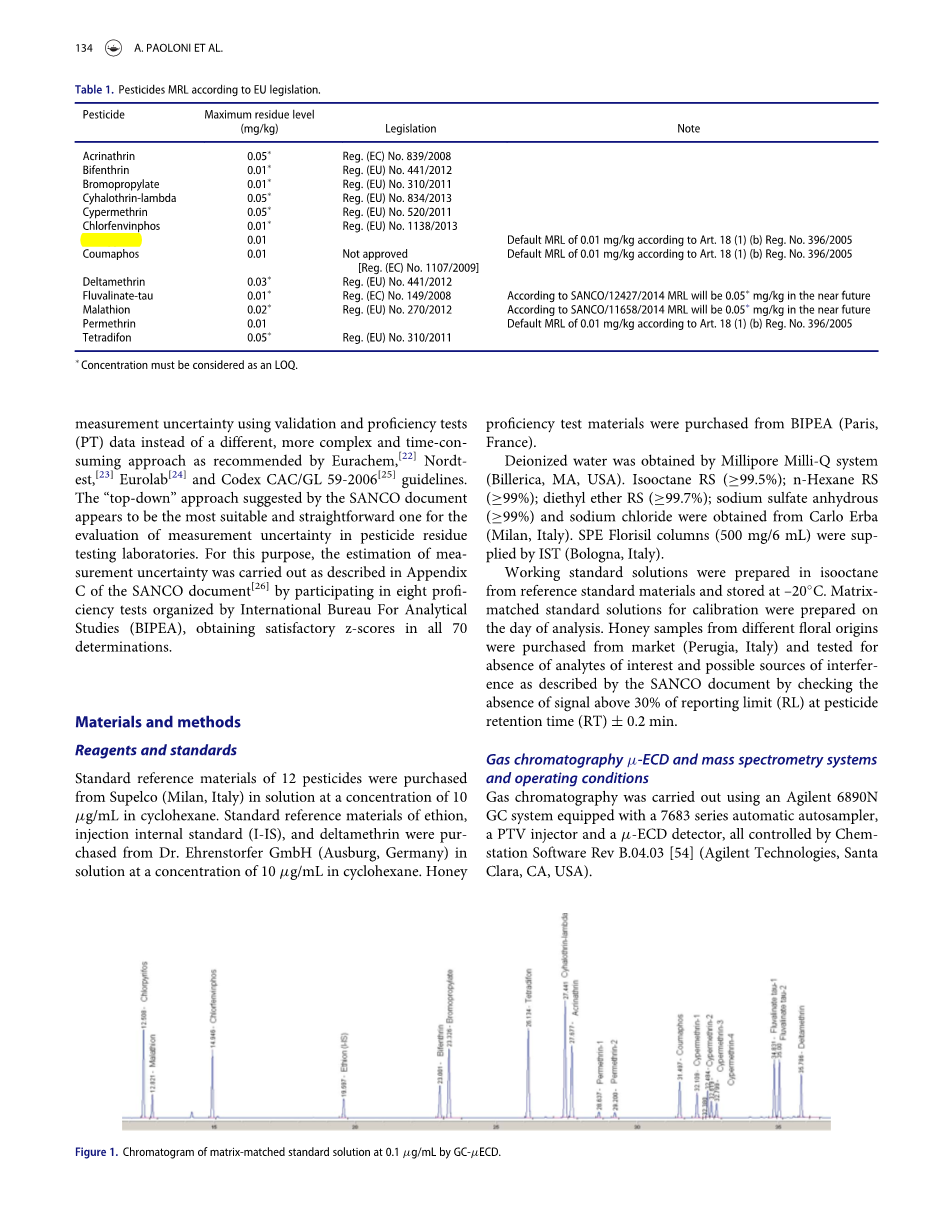 工作标准溶液用标准对照物溶于异辛烷配制而成,储存于- 20℃。与基质匹配的校准标准溶液于分析当日配制。来源于不同花卉的蜂蜜样品是从意大利佩鲁贾的市场买来的,通过SANCO文件中描述的检测农药保留时间plusmn;0.2分钟内高于检测限30%的指示信号的缺失,来测试出不相干的分析物以及干扰物的可能来源。