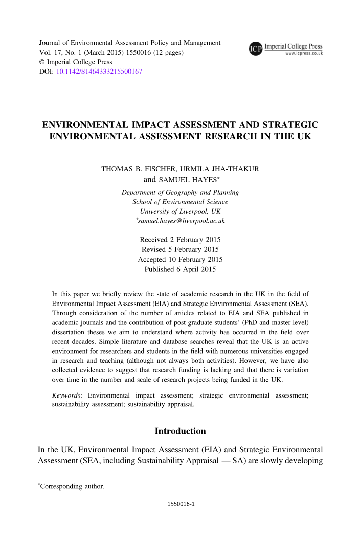 在英国作者的论文中,有40%是专门处理环境影响评价的,28%是关于EIA的,也有10%是关于SEA的。还有另外的10%总的来说是关于战略影响评估的。然后会有越来越多的文献是从社会影响,健康影响和生物多样性以及其他方面的角度来关注EIA/SEA。正式这样的一个重点的改变在EIA的第一个十年和SEA 的第二个十年里变得更广泛起了作用。 大约20%的论文是有概念或者理论基础的,也有10%的论文明确指出是关于效益的。(例如 Arts et al.等人, 2012; Eales and Sheate, 2011)。尽管这样,很少有人基于实验研究成果探讨效益。将近一半的论文包括了一些系统的实践评论,例如对环境报告质量的报告(占出版物的10