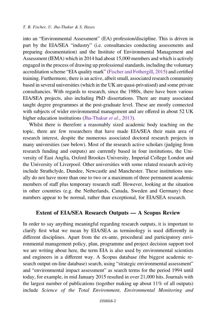 估计Scopus大约有19000个结果是属于环境科学与工程的,只有2000(约10%)来自EIA/SEA事前环境管理决策的支持工具社区。当限制搜索该社区的是三种主要期刊,即《环境影响评估回顾》、《影响评估和项目评价和项目评估》和《环境评估政策与管理杂志》时,这个结果支持上述论点。(据费舍尔和盎扬戈(2012)发布约50%的所有相关的文件)。搜索到1056个结果。大约20种期刊偶尔会发表相关专题的论文(例如《环境管理杂志》,《环境管理》、《政策和计划》等)。在这些结果中,有21%来自英国的作者,加拿大作者排名第二12%、美国(10%)、澳大利亚(10%)、荷兰(6%)和南非(4%)的作者。这意味着大约五分之一用国际语言英语来写的论文都来自英国作家,所以英国在这个领域的影响是显而易见的。