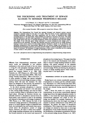 在我们前面说道的工艺中,原理是将磷从液相中分离出,与固相进行结合,因此我们在污泥处理的过程中,必须注意保证磷返回液相所需的最小释放量。尽管在以往的文献中,有着从液相中除磷的大量实验,但是对于富磷污泥的处理和处置却鲜有关注(Ladendorf,1989;Pitman等人,1989)。由于约翰内斯堡产生的大部分废水污泥,用于特定农田上作为其液体硝化污泥进行处理,该市到目前为止仍未意识到污泥中的磷含量。然而,我们需要用更加复杂的污泥处理技术,例如利用脱水,集中控制和去除污泥液中的磷。本文着重在介绍约翰内斯堡为改善污泥处理设施所进行的一系列研究和开发工作,特别是对于富磷废活性污泥(WAS )需要进行相应的浓缩和脱水,以此来限制污泥处理野种的磷含量,再将其回收循环到液相中。