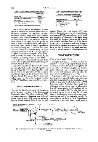 表1显示了在约翰内斯堡进行的一项调查的结果。可以看出,厌氧消化后的污泥液中磷酸盐含量最高,此外,还发现液相中磷的浓度与污泥的处理方式有很大的关系。例如,通过约翰内斯堡的经验表明,原污泥在初沉池(PST)和浓缩机中停留的时间越长,磷的溶解程度越大。这一点很重要,我们可以在活性污泥法中,鼓励人们增加磷酸盐积累细菌增殖所需的可溶性基质,以使原污泥停留在初沉池和浓缩机中时,使磷能够更好地释放(Pitman等人,1987年)。