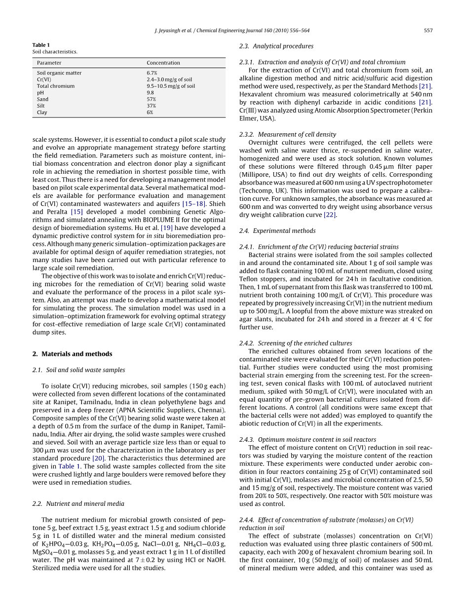 这项工作的目的是分离和富集Cr(VI)还原微生物,用于修复含六价铬的固体废物,并评估过程在中试系统中的性能。 此外,还尝试开发模拟过程的数学模型。 该仿真模型被用于模拟优化框架中,用于演变大规模Cr(VI)污染堆场的经济有效修复的最优策略。