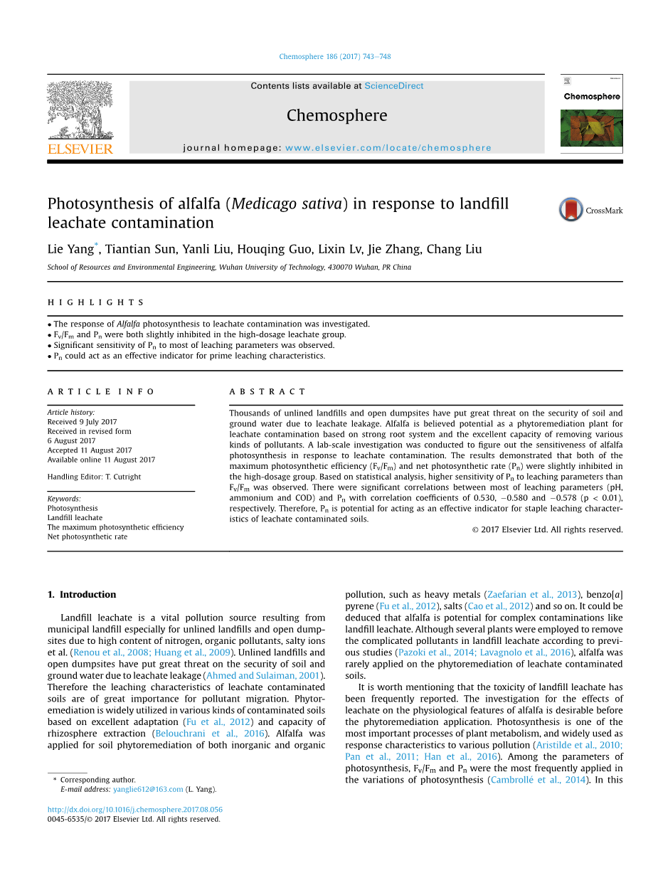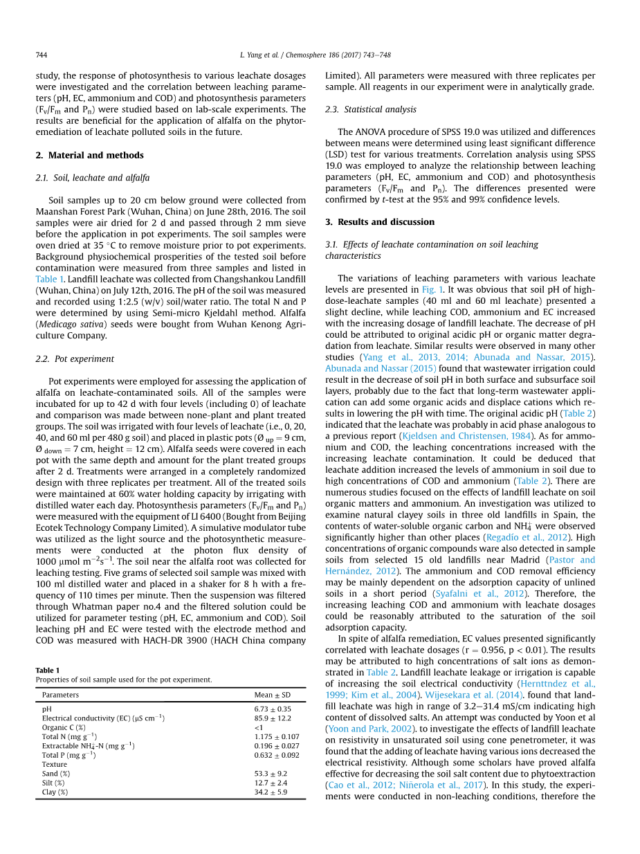 苜蓿用于土壤的植物修复,不论无机和有机污染的土壤,如重金属(Zaefarian等,2013),苯并芘(伏等,2012),类盐(曹等人,2012)等。可以推论出,苜蓿具有处理类似于填埋场渗沥液等复杂污染物的潜力。根据之前的研究,虽然有多种植物被用于清除垃圾填埋场的复杂污染物, (Pazoki et al., 2014; Lavagnolo et al., 2016),但是紫花苜蓿在受污染土壤的植物修复过程中很少被应用。值得一提的是,垃圾填埋场的毒性经常被报道。在应用于植物修复前,对紫花苜蓿生理特征的研究是值得的。光合作用是植物代谢过程中最重要的过程之一,被广泛用作各种污染的反应特征。在光合作用的参数中,F v/F m和P n在表征光合作用的变化中是最常用的。在此研究中,研究了光合作用对各种浸出物的反应,以及浸出参数(pH、EC、铵、COD)和光合作用之间的相关性。研究结果对苜蓿未来在土壤污染土壤中的应用有益。