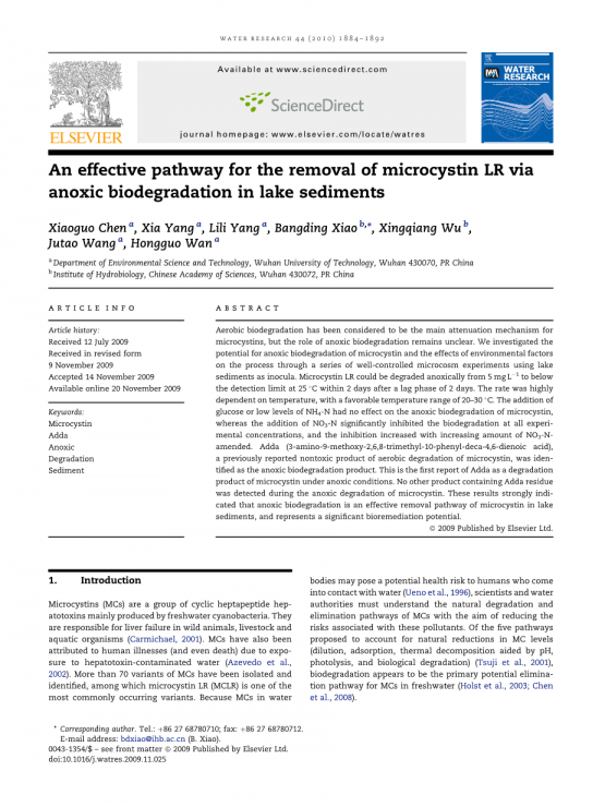 好氧生物降解微囊藻毒素已经被认为是主要降解藻毒素的方法,但厌氧生物降解的作用目前尚不明确。我们调查了微囊藻毒素的厌氧生物降解潜力及环境因素的影响,在此过程中,利用湖泊沉积物作为接种物进行一系列可控微观实验。发现在滞后期2天后,2天25℃下微囊藻毒素LR可由5 mg /L1缺氧降解至检测限以下。降解速率很高程度上取决于温度,在适宜的温度范围内(20-30℃),添加葡萄糖或低NH4-N水平对微囊藻毒素的缺氧生物降解无影响,而加入NO3-N后,所有实验浓度下生物降解均被显著抑制,且随着NO3-N-amended含量的增加,其抑制作用随之增强。Adda(3-氨基-9-甲氧基-2,6,8-三甲基-10-苯基-癸-4,6-二烯酸),之前报道是微囊藻毒素好氧降解的无毒产物,经鉴定也是厌氧生物降解的产物。这是第一份关于Adda降解微囊藻毒素在缺氧条件下产物的报告。微囊藻毒素的厌氧降解过程中未检测到其他含有Adda残留的产物,这些结果有力的表明,厌氧生物降解是湖泊沉积物中微囊藻毒素去除的有效途径,代表了一个重要的生物修复潜力。