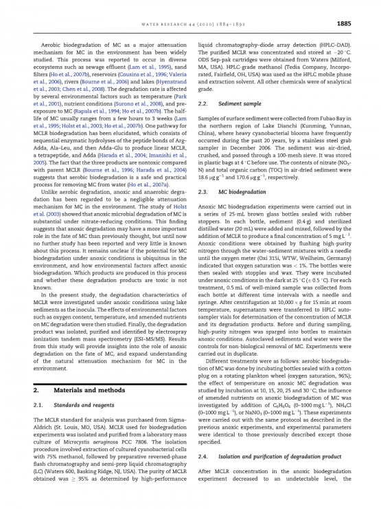 在一系列用橡胶塞密封的25 ml棕色玻璃瓶中进行了厌氧MC生物降解实验。在每个瓶子中加入沉淀物(0.4 g)和消毒蒸馏水(20 mL)混合,然后加入MCLR,最终得到浓度为5 mg/L。用针将高纯度氮通过水-沉积物混合物冲洗得到厌氧条件,直到溶氧仪(Oxi 315i, WTW, Weilheim, Germany)显示氧饱和度lt; 1%。然后用瓶塞和蜡封住瓶子。在25 C(plusmn;0.5 C)的暗处缺氧条件下孵育,每处理一次,用针和注射器在不同时间间隔从每个瓶中采集0.5 mL混合均匀的样品。室温下10,000 r/min离心15min后,将上清液转移至HPLC自动采样瓶中,测定MCLR及其降解产物的浓度。在取样前和取样过程中,将高纯度氮喷入瓶中以维持缺氧状态。以蒸压沉淀物和水混合为对照检测无生物时降解mc的情况,实验重复进行。
