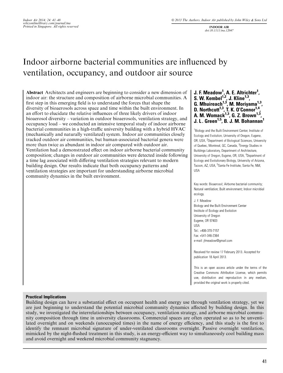 建筑环境中空气里细菌的来源并不为人所知,但包括人类、宠物、土壤和植物,它们既是直接来源,也有粉尘扰动的间接作用(Bowers等人,2011a,b,2012;Tӓubel等人,2009;Womack等人,2010)。室外空气中的细菌群落是短暂的,可以在短时间内随着气候条件的变化而变化(Fierer等人,2008;Rintala等人,2008;Womack等人,2010),但室外空气变异性对室内空气细菌群落的影响尚不清楚。先前的研究表明,人的居住(占用)会增加空气中的细菌负荷,并在建筑物内留下明显的人体微生物信号(Hospodsky等人,2012;Qian等人,2012),自然通风确实会在没有活跃地人类占用的情况下影响空气中的细菌群落组成(kembel等人,2012),但我们目前对通风以及人类的占用对现代建筑中生物气溶胶的相对影响还了解甚少。我们也不了解室内和室外空气中微生物群落的连通程度。