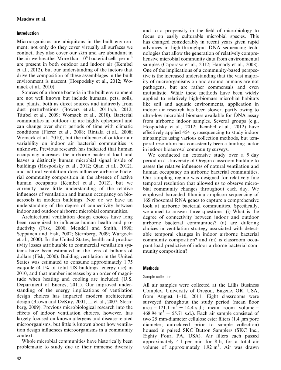 长期以来,人们认为建筑通风设计的选择会影响人类健康和生产力(Fisk,2000;Mendell和Smith,1990;SeppӓANen和Fisk,2002;Sternberg,2009;Wargockietal.,2000)。在美国,商业通风系统造成的健康和生产损失估计达数百亿美元(Fisk,2000)。据估计,美国的建筑通风消耗了大约1.75艾焦耳(占美国建筑总能耗的4.1%),当进行加热和冷却时,这个数字会增加一个数量级(美国能源部,2011)。我们提高了通风设计选择对能源影响而影响了现代建筑设计的理解(Brown和Deay,2001;Lietal.,2007;Sternberg,2009)。然而,以往对室内通风选择的影响的微生物研究主要集中在已知的过敏原和与疾病相关的微生物上,但关于通风设计如何影响群落中微生物的研究知之甚少。