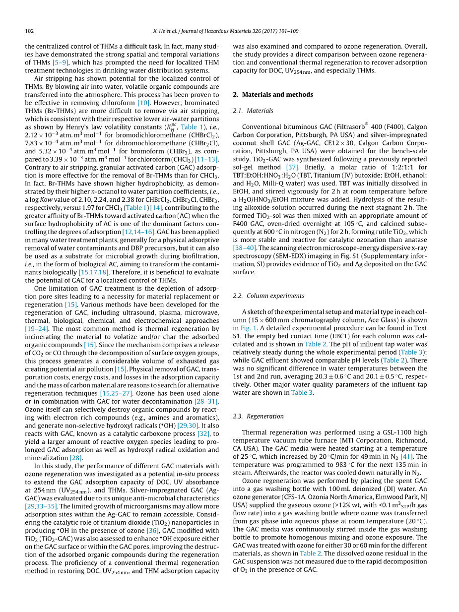 研究了不同GAC材料的臭氧再生性能,并将其作为一种潜在的原位工艺来提高GAC对DOC的吸附能力,在254 nm处的紫外吸收(UV254nm)和THMs。银浸渍GAC (AgGAC)因其独特的抗微生物特性而被评价[29,33 - 35]。微生物的有限生长可能允许更多的吸附位点在Ag-GAC中保持可获得。考虑到二氧化钛(TiO2)纳米粒子在臭氧[36]存在下产生bull;OH的催化作用,研究了TiO2(TiO2-GAC)修饰的GAC增强了bull;OH在GAC表面或孔隙内的暴露,提高了再生过程中对吸附有机物的破坏。常规热再生方法对DOC、UV254 nm和THM的吸附能力的熟练程度与臭氧再生进行了比较。总的来说,本研究直接比较了臭氧再生和常规热再生对DOC、UV254 nm,特别是THMs的吸附能力的恢复。