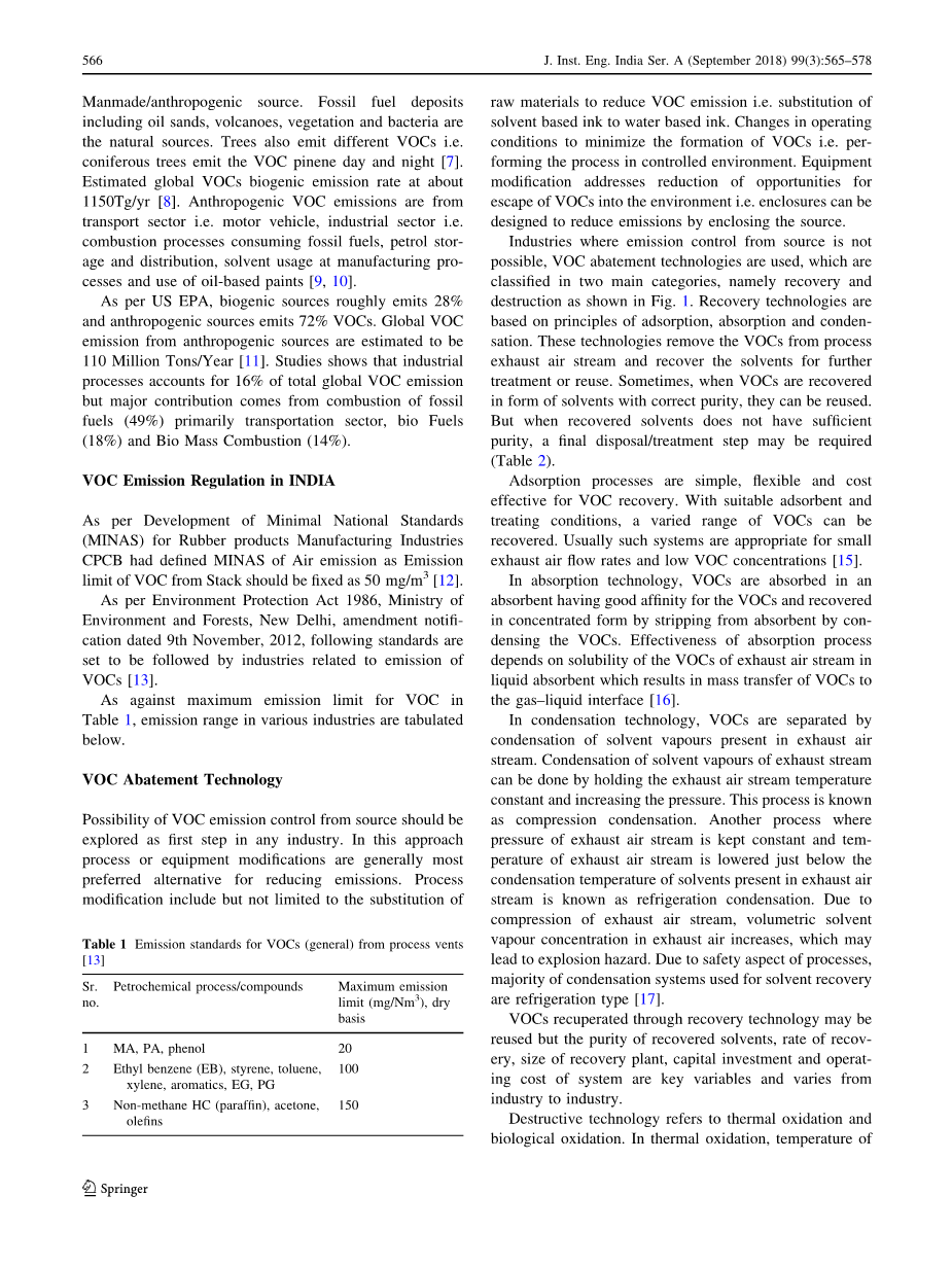 根据橡胶制品制造业最低国家标准(MINAS),CPCB已将空气排放的MINAS确立为烟囱中VOC的排放限值应固定为50 mg / m3 [12]。根据新德里环境和森林部的1986年《环境保护法》,2012年11月9日的修正案规定,与排放挥发性有机化合物有关的行业将遵循以下标准[13]。