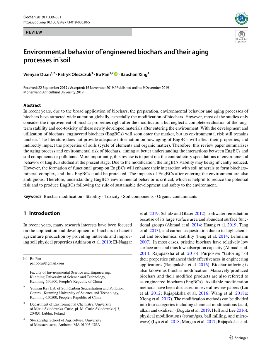 近年来,由于生物炭的广泛应用,生物炭的制备、环境行为和老化过程受到了全球的广泛关注,特别是生物炭的改性。然而,大多数的研究只考虑了改性后生物炭性能的改善,而忽略了对这些新开发材料进入环境后的长期稳定性和生态毒性进行完整的评价。随着生物炭的开发和利用,工程生物炭(EngBCs)将很快进入市场,但其环境风险尚不明确。文献没有提供足够的信息说明EngBCs的老化将如何影响它们的性质,并间接影响土壤的性质(元素和有机质的循环)。因此,本文综述了生物炭的老化过程和环境风险,旨在更好地理解EngBCs与土壤成分或污染物之间的相互作用。更重要的是,本文指出了目前研究中EngBCs环境行为的矛盾推测。由于改性,EngBCs的稳定性可能会显著降低。然而,EngBCs上官能团的形成会增强它们与土壤矿物质的相互作用,形成生物炭-矿物复合物,从而保护EngBCs。EngBCs进入环境后的影响也不明确。因此,了解EngBCs的环境行为是至关重要的,这有助于减少潜在的风险,并按照可持续发展和环境安全的原则生产EngBCs。