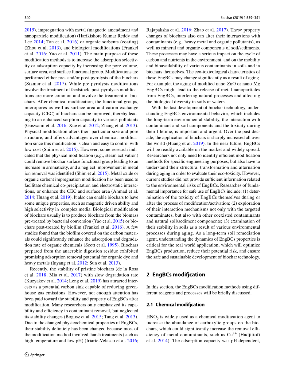 近年来,许多研究偏好集中在生物炭的应用与开发上,例如生物炭可提供养分和改善土壤物理性质来促进农业生产,而在土壤/水修复中,主要依赖于生物炭表面积大、表面官能团丰富以及由于其较高的化学和生物化学稳定性而实现的碳封存。在大多数情况下,原始生物炭的表面积相对较低,因此吸附容量较低。有目的的“剪裁”它们的特性,提高了它们在工程应用中的有效性。生物炭裁剪也被称为生物炭改性。大规模生产的生物炭及其改性产品也被称为工程生物炭(EngBCs)。几篇综述文章讨论了可用的修改方法。改性方法可分为四类,包括化学改性(酸、碱和氧化剂),物理改性(蒸汽/气体,球磨和微波),金属浸渍(磁性修饰和纳米粒子修饰)或有机吸附剂(涂层),以及生物改性。这些改性方法的主要目的是通过增加孔体积、表面积和表面官能团来提高吸附选择性或吸附容量。生物炭的改性可以在生物炭热解前和/或热解后进行修改。热解前的改性涉及到原料的处理,热解后的改性更常见,涉及到生物炭的处理。经过化学改性后,生物炭的官能团、微孔、比表面积和阳离子交换容量(CEC)都得到了改善,从而增强了对各种污染物的吸附能力。物理改性可以改变它们特定的尺寸和孔隙结构,而且比化学改性更有优势,因为这种改性干净、易于控制、成本低。然而,一些研究表明,物理改性(如蒸汽活化)可以去除生物炭表面官能团,导致芳香度的增加,并发现忽视了金属离子去除的改善。金属氧化物或有机吸附剂浸渍改性已被用于促进化学共沉淀和静电相互作用,或提高CEC和表面积。它也使生物炭具有一些独特的特性,如磁性驱动能力和在复杂介质中的高选择性。生物炭的生物改性通常是将经过细菌转化预处理的生物质或经生物膜处理后的生物炭制成生物炭。少数研究发现,覆盖在碳材料上的生物膜可以显著提高有机化学品的吸附和降解速率。从厌氧消化残渣中制备的生物炭对有机染料和重金属的吸附去除潜力很大。