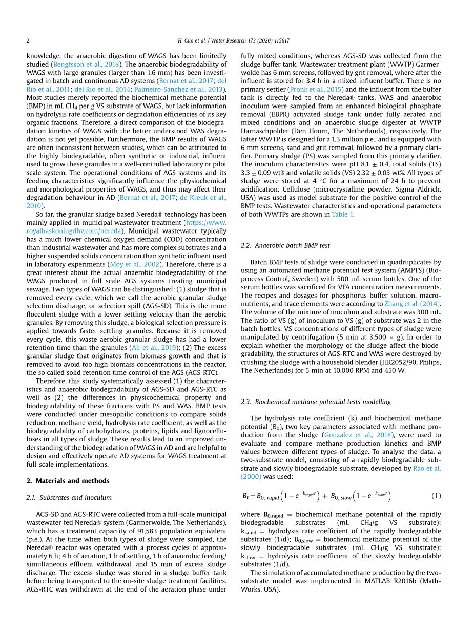 AGS-SD和AGS-RTC收集自一个全规模的城市污水供水Neredareg;系统(荷兰Garmerwolde),该系统的处理能力为91,583人口当量(P.E.)。在对两种类型的污泥进行取样时,NEREDAreg;反应器的运行工艺周期约为6小时;曝气4小时,沉降1小时,厌氧进水/同时排出污水1小时,剩余污泥排放15分钟。剩余污泥储存在污泥缓冲池中,然后运往现场污泥处理设施。AGS-RTC在充分混合条件下曝气阶段结束时退出,而AGS-SD则从污泥缓冲池中收集。污水处理厂(WWTP)的Garmerwolde有6 mm的筛网,然后去除砂粒,之后将进水在混合进水缓冲器中储存3.4h。没有主沉淀器(Pronk等人,2015年),缓冲池的进水直接进入Neredareg;池。分别从完全曝气和混合条件下的强化生物除磷(EBPR)活性污泥池和荷兰Den Hoorn的WWTP Harnaschpoder厌氧污泥消化池中采集了细菌和厌氧接种物。后者的污水处理厂设计处理能力为130万立方米,并配备6毫米筛网,除砂和除砂,然后是一次澄清池。(工业和信息化部电子科学技术情报研究所陈皓)。从该初级澄清池采集初级污泥(PS)。接种物特性为pH8.1plusmn;0.4,总固形物(TS)3.3plusmn;0.09wt%,挥发性固形物(VS)2.32plusmn;0.03wt%。所有类型的污泥都在4°C下储存最长24小时,以防止酸化。以美国Sigma Aldrich公司生产的微晶粉纤维素为模型底物,进行BMP检测的阳性对照。两个污水处理厂的废水特性和运行参数见表1。