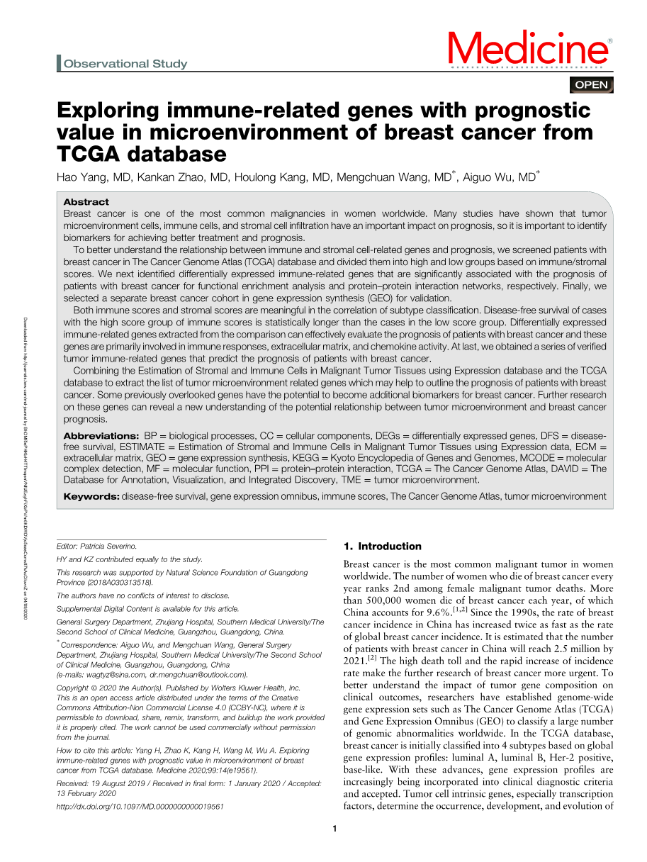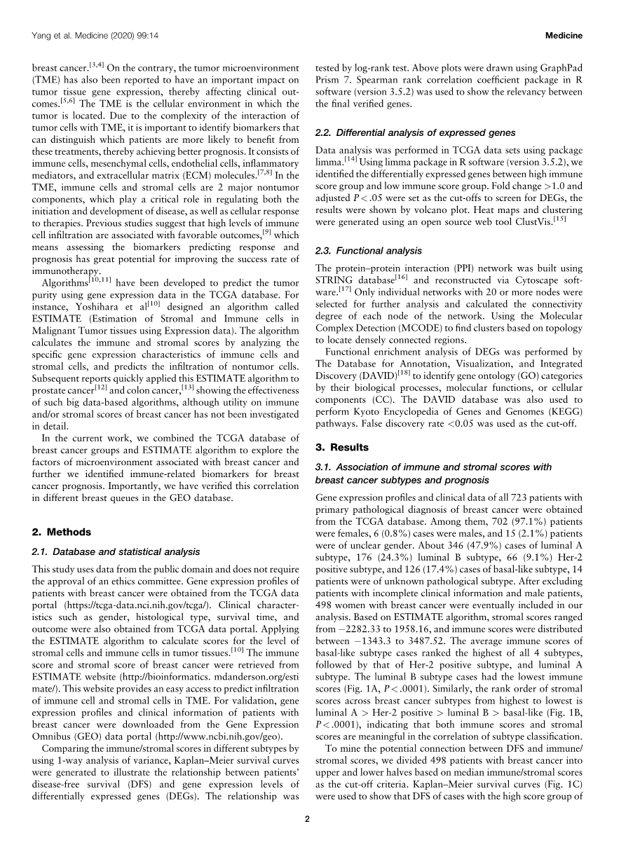 乳腺癌是全世界女性最常见的恶性肿瘤。每年死于乳腺癌的女性人数在女性恶性肿瘤死亡人数中排名第二。每年有50多万妇女死于乳腺癌,其中中国占9.6%。20世纪90年代以来,中国乳腺癌发病率的增长速度是全球乳腺癌发病率增长速度的两倍。据估计,到2021年我国乳腺癌患者人数将达到250万,高死亡率和发病率的迅速上升使乳腺癌的进一步研究更加迫切。为了更好地理解肿瘤基因组成或临床结果的影响,研究者们建立了TCGA和GEO等全基因组表达集,对全球范围内的大量基因组异常进行了分类。在TCGA数据库中,根据整体基因表达谱初步将乳腺癌分为4个亚型:luminal A、luminal B、Her-2阳性、base-like。随着这些进展,基因表达谱越来越多地被纳入。纳入临床诊断标准并被接受。肿瘤细胞的内在基因,尤其是转录因子,决定了肿瘤的发生、发展和进化成乳腺癌。与此相反,也有报道称肿瘤微环境(tumor microenvironment, TME)对肿瘤组织基因表达有重要影响,从而影响临床结局。TME是肿瘤所在的细胞环境。由于肿瘤细胞与TME相互作用的复杂性,识别能够区分哪些患者更有可能从这些治疗中获益的生物标志物,从而实现更好的预后是非常重要的。它包括免疫细胞、间充质细胞、内皮细胞、炎症介质和细胞外基质(ECM)分子。在TME中,免疫细胞和基质细胞是两种主要的非肿瘤成分,它们在疾病的发生和发展以及细胞对治疗的反应中发挥着重要的调节作用。以前的研究表明,高水平的免疫细胞浸润与良好的预后相关,这意味着评估生物标志物预测反应和预后对于提高免疫治疗的成功率有很大的潜力。