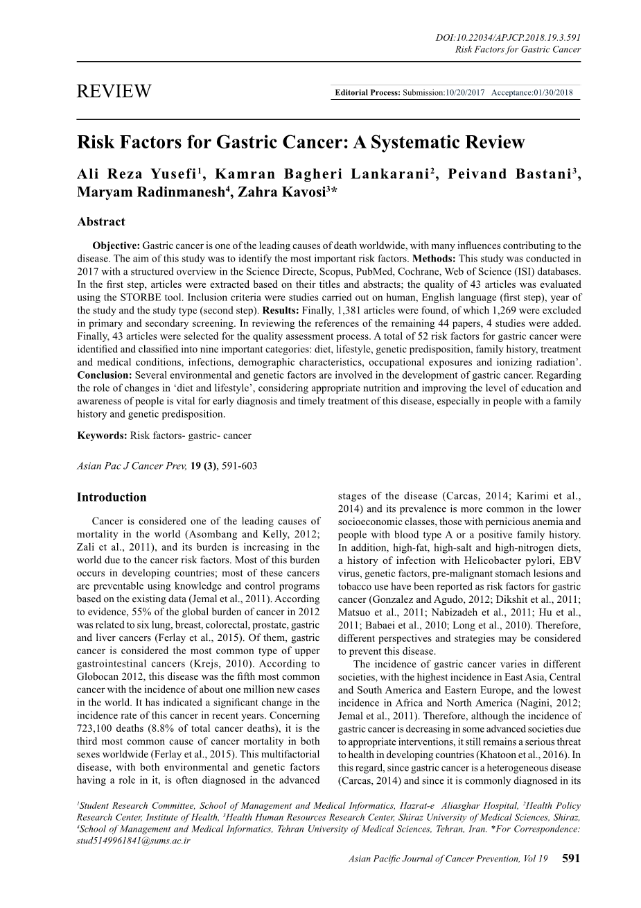 这项研究的目的是确定胃癌的危险因素。在9个部分中总共确定了52个危险因素。许多研究中都提到了其中一些因素。
