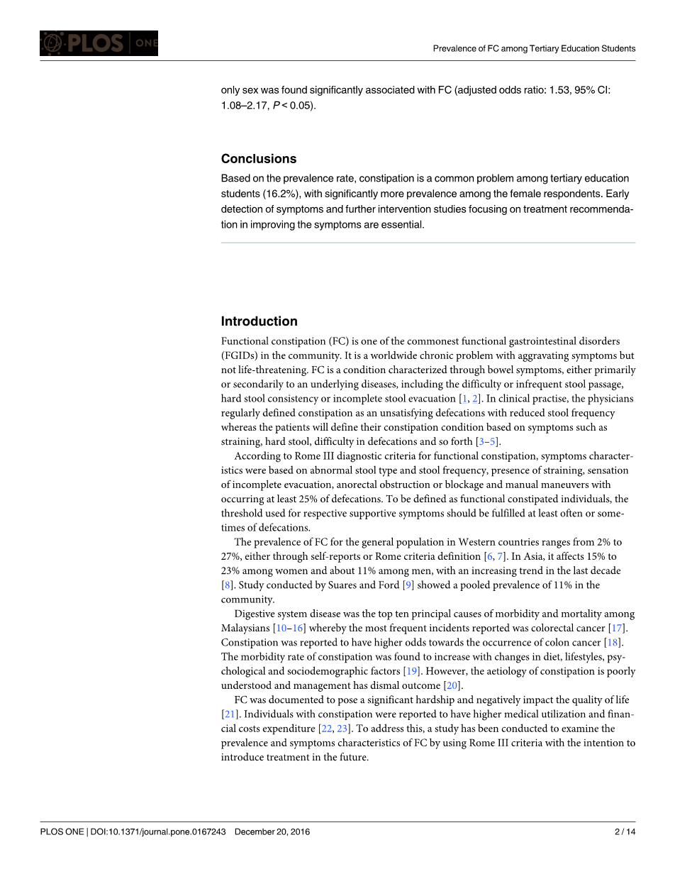 通过单因素logistic回归分析,结果显示FC与性别(OR:1.48,95%CI:1.06-2.06,Plt;0.05)和年龄(OR:1.34,95%CI:1.01-1.79,Plt;0.05)之间存在关联性。根据Rome Ⅲ的诊断标准,发现女性FC发病率更高。此外,随年龄增大,FC发病率也随之上升。但是,统计分析结果来看,FC与种族,学历,婚姻状况,收入水平,吸烟状况,饮酒状况和体重状况之间没有显着相关性。通过多因素logistic回归分析,仅有性别是FC相关因素(校正ORrsquo;:1.53,95%CI:1.08–2.17,Plt;0.05)。