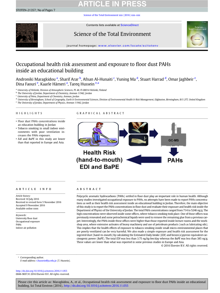 在本研究中,我们旨在报导教育大楼(约旦大学物理系)内地板粉尘中PAHs的浓度。 我们还通过计算估计每日摄入量(EDI)和苯并(a)毒性当量(BaPE)对摄入的粉尘(作为PAHs的载体)进行了简单的暴露和健康风险评估。