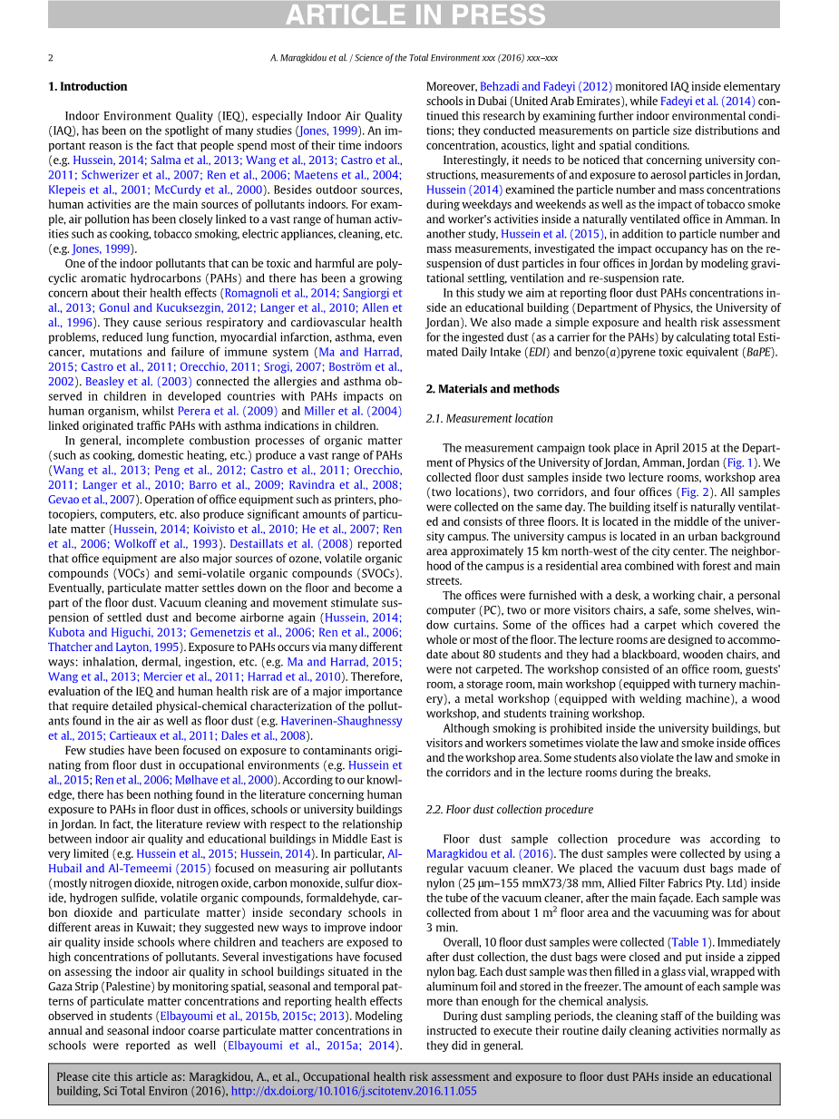 很少有对职业环境中源自地板灰尘的污染物暴露的研究。据我们所知,在文献中没有发现人类接触约旦办公室,学校或大学建筑物内地板灰尘中多环芳烃的研究。实际上,有关中东地区室内空气质量与教育建筑之间关系的文献综述也非常有限。特别是对于科威特地区不同中学测量的空气污染物(主要是二氧化氮,氮氧化物,一氧化碳,二氧化硫,硫化氢,挥发性有机化合物,甲醛,二氧化碳和颗粒物);提出了新的方法来改善学校的室内空气质量,在这些学校中,儿童和教师暴露于高浓度的污染物中。几项调查的重点是通过监测颗粒物浓度的空间性,季节性和时间性,和对学生的健康影响,评估加沙地带(巴勒斯坦)的教学楼内的室内空气质量,还模拟了学校季节和年度室内粗颗粒物浓度的模型。此外,Behzadi等人在迪拜(阿拉伯联合酋长国)的小学对室内空气质量进行了监测,而Fadeyi等人则通过对粒度分布和浓度,声学,光和空间条件进行了测量来监测室内空气质量。