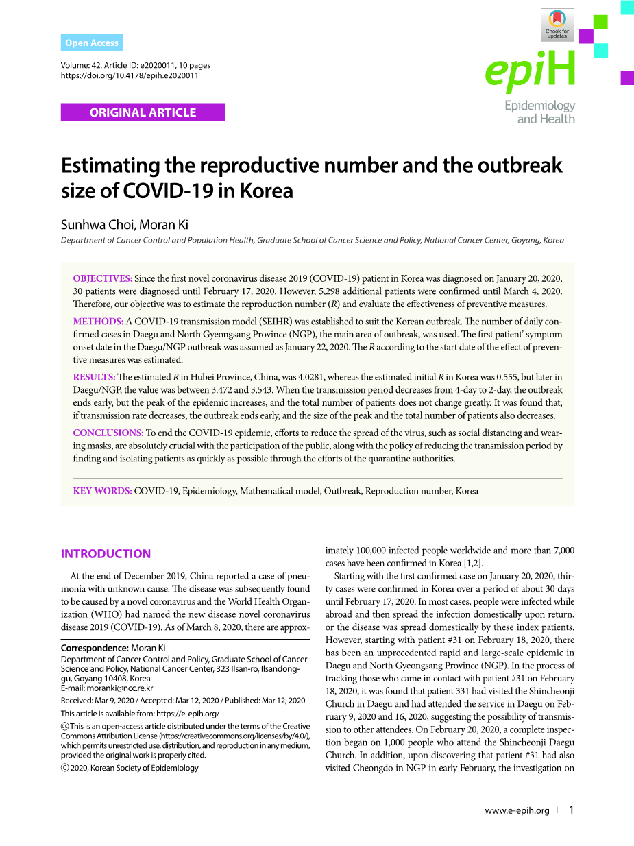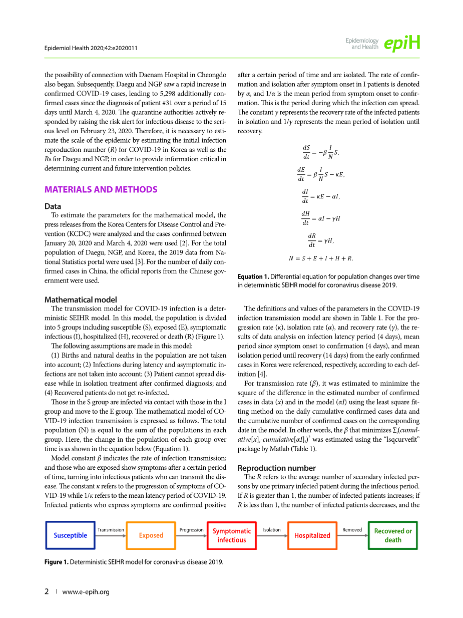 从2020年1月20日确诊首例病例开始,到2020年2月17日为止的约30天时间内,韩国确诊了30例病例。在多数情况下,在国外受到感染的人回国后在国内进行传播,或者由这些指示病例直接在国内传播的。然而,从2020年2月18日的第31例病例开始,大邱和庆尚北道暴发了一场前所未有的快速发展的大规模疫情。我们在追踪2020年2月18日第31号患者的接触者的过程中,发现该患者参观了大邱的新天地教堂,并分别于2020年2月9日和16日参加了教堂的活动,这暗示该患者有可能在此过程中将新冠肺炎病毒传播给其他与会者。所以,2020年2月20日,我们对大邱新天地教会的1000名信徒进行了全面检查。此外,在发现第31号患者在2月初也曾去过庆尚北道的清道后,我们开始调查与清道郡大南医院有关的可能性。随后,大邱和庆尚北道的新冠肺炎病例数量迅速增加,自第31号患者被确诊到2020年3月4日的15天内,又新增确诊病例5298例。对此,疫情防控部门积极应对,于2020年2月23日将传染病风险预警提升至严重级别。因此,有必要通过估算韩国新型冠状病毒肺炎疫情的初始再生数(R)以及大邱和庆尚北道的再生数(R)来估计新冠肺炎疫情的规模,以便为今后疫情干预政策的确定提供重要依据。