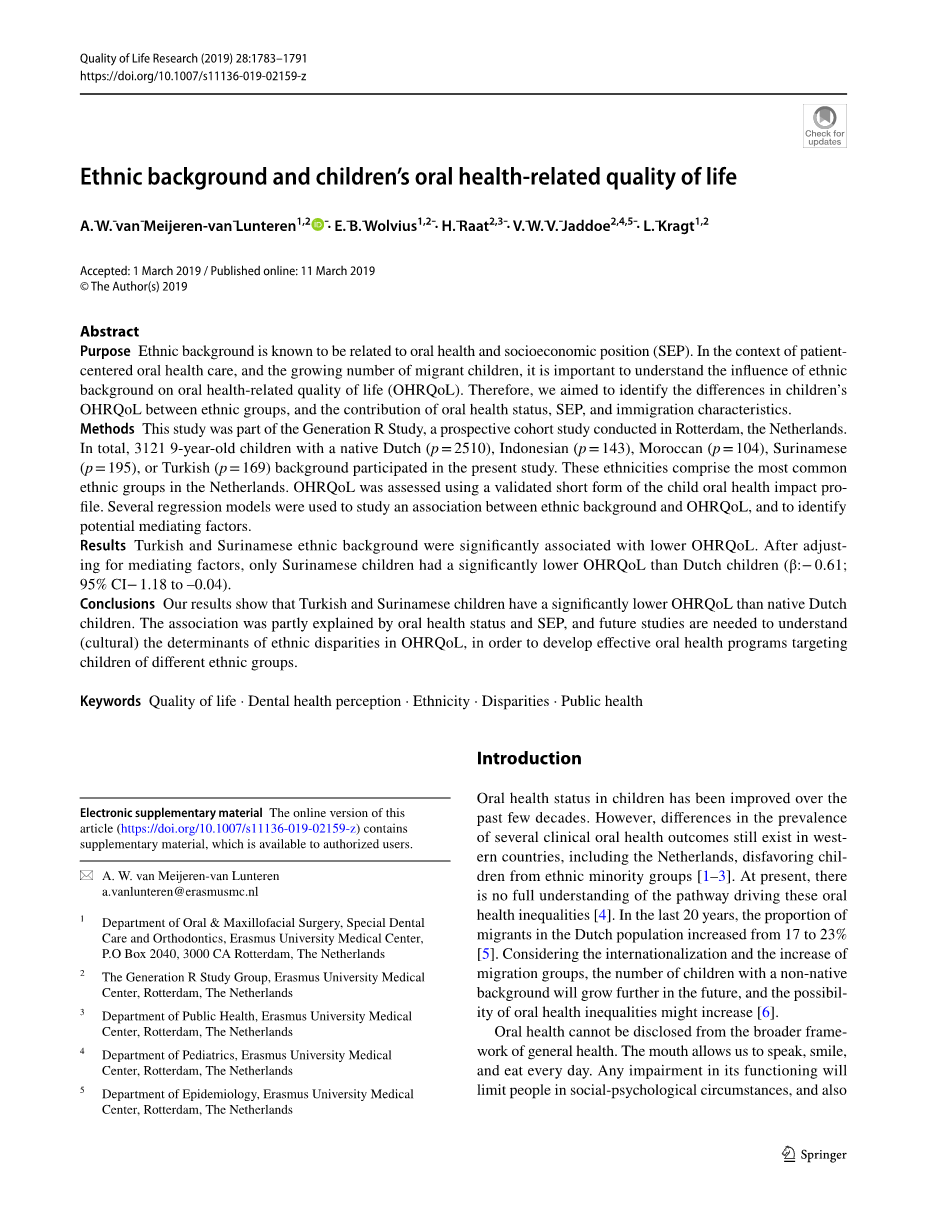 A W van Meijeren-van Lunteren, E B Wolvius,H Raat,V W V Jaddoe , L Kragt