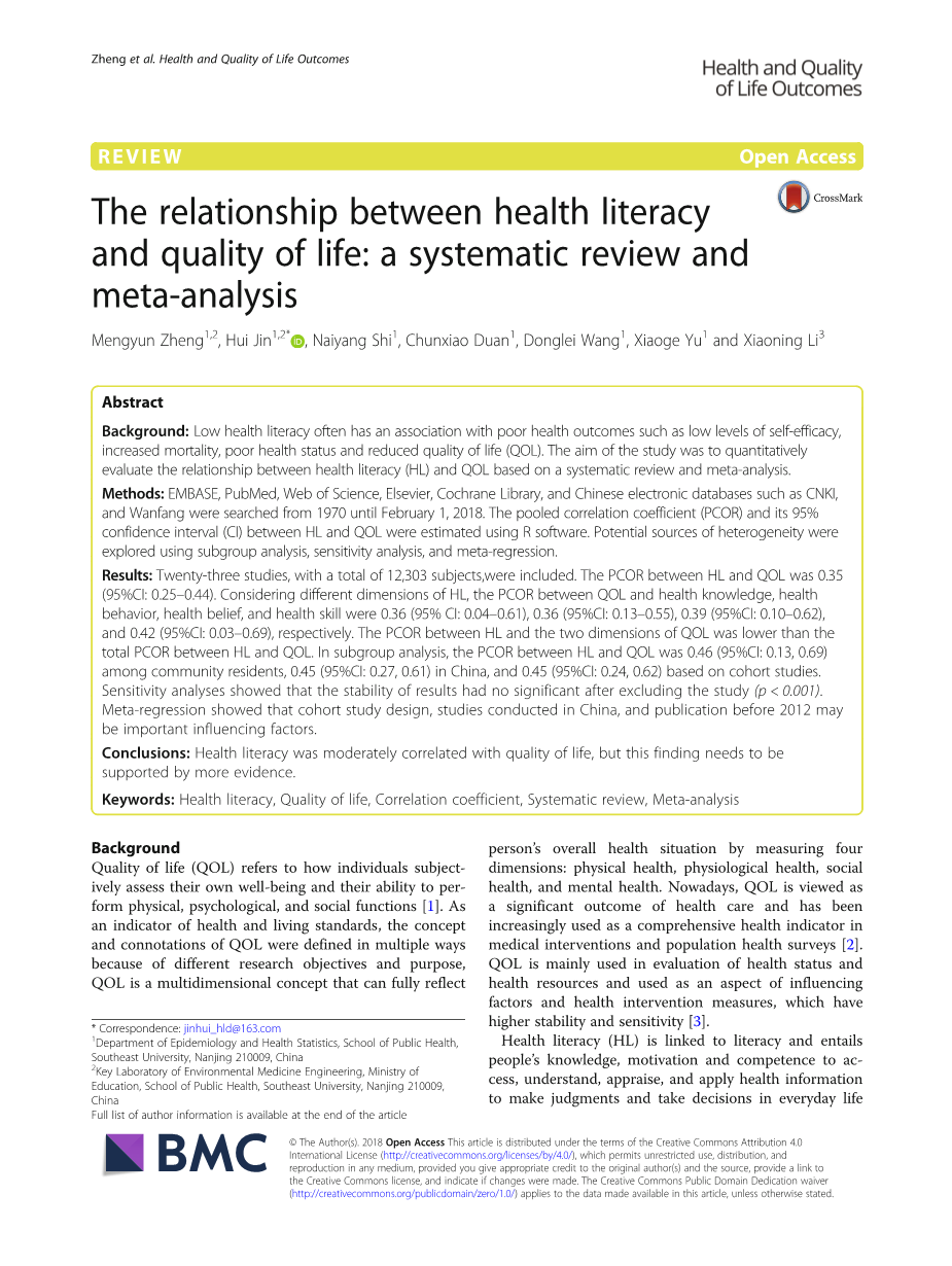 摘要:背景:如果居民的健康素养水平低,往往后导致不良的健康结果,如自我效能水平低、死亡率增加、健康状况不佳和生活质量下降(QOL)。本研究的目的是在系统综述和荟萃分析的基础上,定量评价居民健康素养(HL)与QOL之间的关系。方法:检索了1970年到2018年2月1日的EMBASE、PubMed、Web of Science、Elsevier、Cochrane Library,以及中国知网、万方等中文电子数据库的文献。用R软件估计HL与QOL的偏相关系数(PCOR)及其95%置信区间(CI)。使用亚组分析、敏感性分析和荟萃回归来探索异质性的潜在来源。结果:共纳入23项研究,其中包含12303名受试者。HL和QOL之间的PCOR为0.35(95%CI:0.25,0.44)。在HL不同维度中,QOL与健康知识、健康行为、健康信念和健康技能之间的PCOR分别为0.36(95%CI:0.04,0.61)、0.36(95%CI:0.13,0.55)、0.39(95%CI:0.10,0.62)和0.42(95%CI:0.03,0.69)。HL与QOL两个维度之间的PCOR低于HL与QOL之间的总PCOR。在亚组分析中,全人群的HL和QOL之间的PCOR值为0.46(95%CI:0.13,0.69),中国居民为0.45(95%CI:0.27,0.61),基于队列研究的结果为0.45(95%CI:0.24,0.62)。敏感性分析显示:排除本研究后,结果的稳定性无差异显著性(plt;0.001)。荟萃回归分析显示,队列研究设计、在中国进行的研究和2012年前的出版物可能是重要的相关因素。结论:居民健康素养与生活质量中度相关,但这一发现需要更多证据的支持。