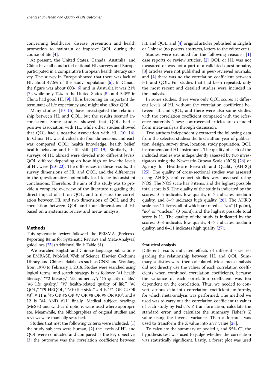 符合标准的研究应包括:[1]研究对象是人;[2]作为关键目标,进行了HL和QOL水平的研究和比较;[3]结果是HL和QOL之间的相关系数;[4]以英文或中文发表的原创文章(无海报摘要、致编辑的信件等)。