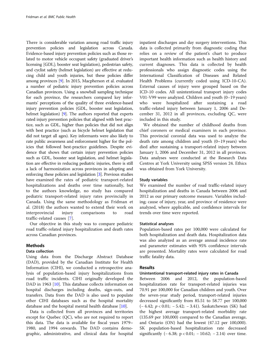我们从每个省的首席验尸官或法医那里获得了儿童死亡人数。利用该省的胸骨数据分析了2006年1月1日至2012年12月31日期间各省因交通事故死亡的儿童少年(0-19岁)的死亡率。数据分析是在约克大学的研究数据中心使用SPSS版本24进行的。从约克大学获得伦理学认可。