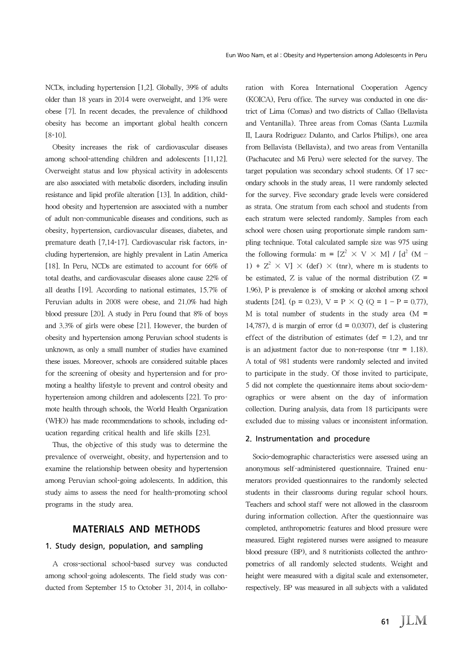 一项基于学校的横断面调查于在校青少年中实施。这项实地研究于2014年9月15日至10月31日和韩国国际协力事业部(KOICA)秘鲁办事处合作进行。这项调查是在利马的一个地区(Comas)和卡拉奥的两个地区(Bellavista和Ventanilla)进行的。来自Comas的三个地区(Santa Luzmila II,Laura Rodri Guez Dulanto和Carlos Phili PS),一个来自Bellavista的地区(Bellavista),以及来自Ventanilla的两个地区(Pachacutec和Mi秘鲁)被选为研究区域,目标人群是中学生。在研究区域内的17所中学中,随机抽取了11所中学进行调查。五个中学年级水平被认为是层。每所学校随机抽取一层,每层随机抽取学生。采用单样本随机抽样的方法,从各学校抽取样本。M=[Z2times;Vtimes;M]/[D2(M-1) Z2times;V]times;(def)times;(tnr),其中m为待估学生,Z为正态分布(Z=1.96),P为在校学生吸烟或饮酒情况。(P=0.23),V=Ptimes;Q(Q=1-P=0.77),M为研究区域学生总数(M=14787),d为误差幅度(d=0.0307),def为估计分布的聚类效应(def=1.2),tnr为无应答调整因子(tnr=1.18)。共有981名受试者参加了这项研究。应邀参加者中,有5人未完成有关社会地理信息的调查或在信息收集当天缺席。在分析过程中,由于缺失值或信息不一致,18名参与者的数据被排除在外。