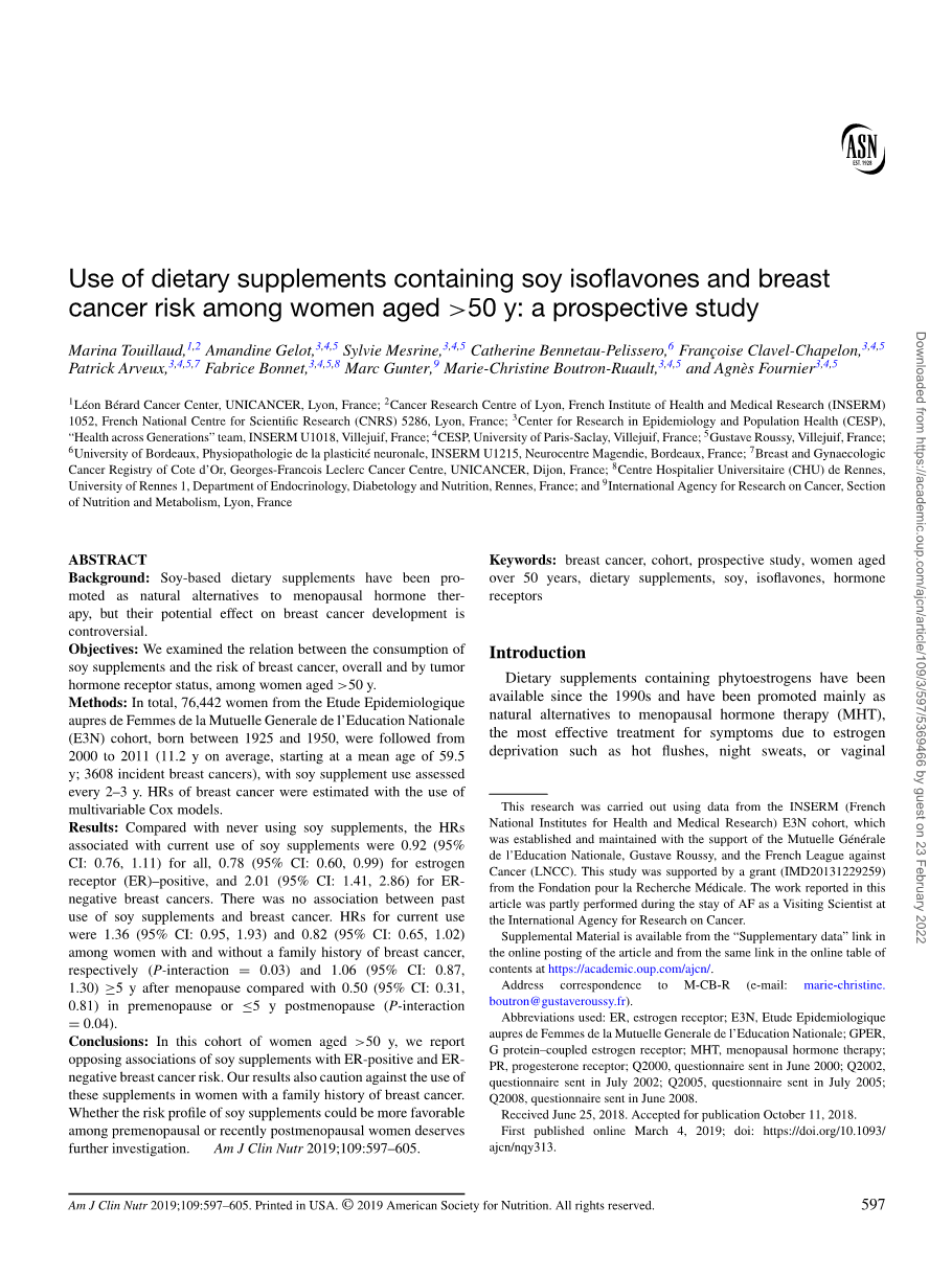 Marina Touillaud,1,2 Amandine Gelot,3,4,5 Sylvie Mesrine,3,4,5 Catherine Bennetau-Pelissero,6 Franccedil;oise Clavel-Chapelon,3,4,5