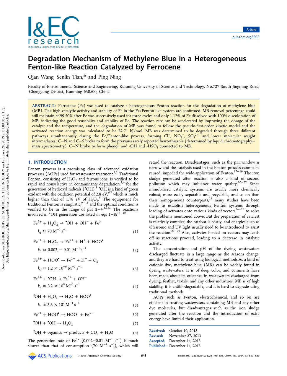 摘要:二茂铁被用来催化非均相芬顿反应降解亚甲基蓝。证实了二茂铁/类芬顿体系中二茂铁的高催化活性和稳定性。二茂铁连续使用三次后,甲基溴的去除率仍保持在99.50 %,只有1.12 %的二茂铁溶解,甲基溴100 %变色,表明二茂铁具有良好的重复使用性和稳定性。通过提高催化剂的用量和温度可以加快反应速度,甲基溴的降解符合一级动力学模型,活化反应能计算为82.71 kJ/mol。在类二茂铁/芬顿过程中,甲基溴被确定通过三种不同的途径同时降解,形成cl-、NO3-、SO42-和较低分子量的中间体:碳氮和碳硫断裂形成以前很少报道的苯并噻唑(通过液相色谱-质谱测定),碳氮断裂形成苯酚,和连接到甲基溴上的-羟基和-羟基臭氧。