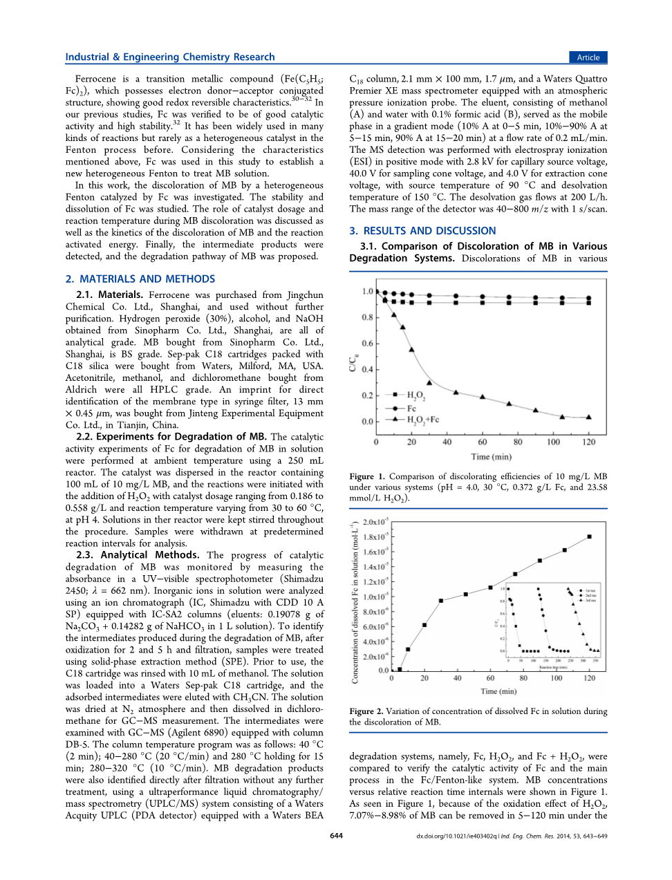 二茂铁是过渡金属化合物(铁( C5H5Fc)2 ),其具有电子供体-受体共轭结构,显示出良好的氧化还原可逆特性30-32。在我们以前的研究中,Fc被证实具有良好的催化活性和高稳定性32。它已被广泛应用于多种反应中,但以前很少作为芬顿过程中的多相催化剂。考虑到上述特点,本研究采用Fc建立了一种新的非均相芬顿处理甲基溴溶液。研究了Fc催化的非均相芬顿对甲基溴的脱色作用。研究了Fc的稳定性和溶出度。讨论了催化剂用量和反应温度在甲基溴变色过程中的作用,甲基溴变色动力学和反应活化能。最后,对中间产物进行了检测,并提出了甲基溴的降解途径。