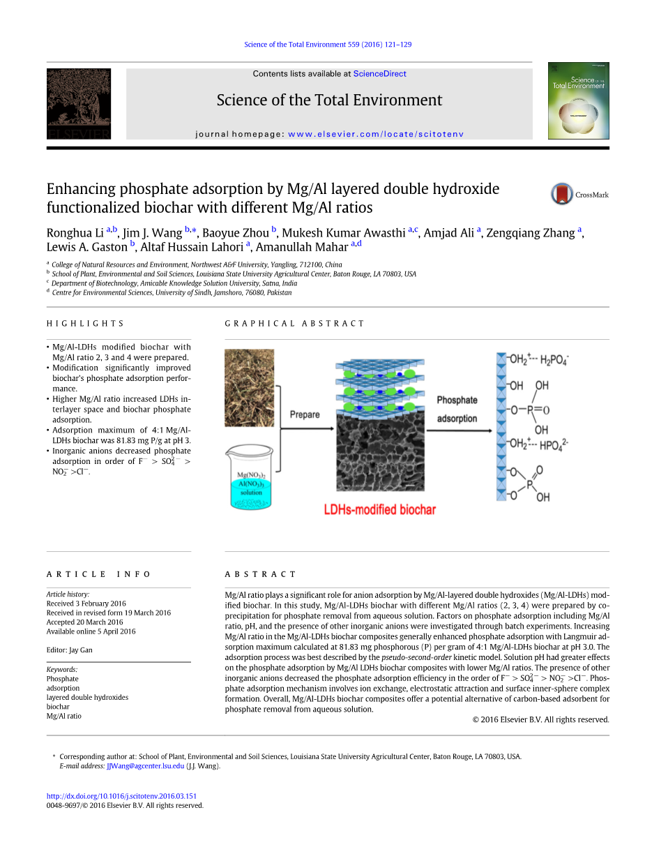 不同Mg/Al比例的Mg/Al层状双氢氧化物功能化生物炭增强对磷酸盐的吸附