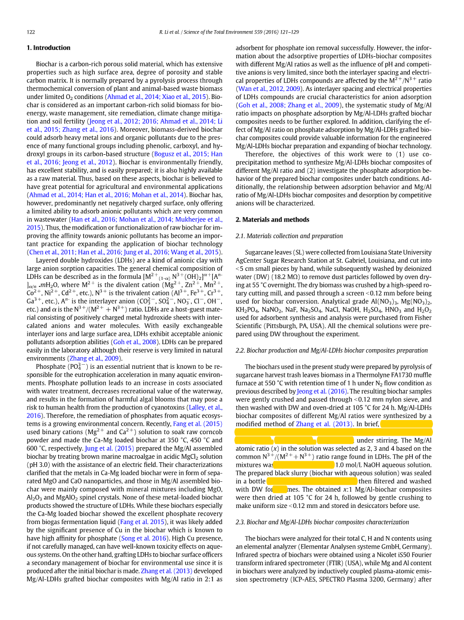 磷酸盐(PO43-)是一种重要的营养物质,在许多水环境中是导致富营养化加速的主要原因。磷酸盐污染导致与水处理相关的成本增加,降低水道的娱乐价值,并导致有害藻华的形成,这些藻华可能因产生蓝耳毒素而对人类健康构成风险(Lalley等人,2016)。因此,水生生态系统中磷酸盐的修复是一个日益受到关注的环境问题。最近,Fang et al.(2015)使用二元阳离子(Mg2 和Ca2 )溶液浸泡生玉米芯粉末,并分别在350℃、450℃和600℃下制备载Ca-Mg生物炭。Jung等人(2015年)在酸性MgCl2溶液(pH 3.0)中,借助电场处理褐藻,制备了Mg/Al组装生物炭。其表征结果表明,钙镁负载生物炭中的金属以分离的MgO和CaO纳米粒子的形式存在,而镁铝组装生物炭中的金属主要由MgO、Al2O3和MgAlO2尖晶石晶体等矿物混合物组成。这些载金属生物炭产品均未显示出LDHs的结构。虽然这些生物炭,尤其是Ca-Mg负载生物炭显示出从沼气发酵液中出色的磷酸盐回收率(Fang et al.2015),但很可能是由于生物炭中大量存在铜(已知其对磷酸盐具有高亲和力)(Song et al.2016)。高含量铜的存在,如果不小心管理,可能会对水系统产生巨大的毒性影响。另一方面,将LDHs接枝到生物炭表面是对环境用生物炭的二次管理,因为它是在制备初始生物炭之后生产的。Zhang等人(2013)成功开发了Mg/Al比例为2:1的Mg/Al-LDHs接枝生物炭复合材料,作为去除磷离子的吸附剂。然而,关于不同Mg/Al比率的LDHs生物炭复合材料的吸附性能以及pH值和竞争性阴离子的影响的信息非常有限,因为LDHs化合物的层间距和电性能都受到M2 /N3 比率的影响(Wan et Al.,2012,2009)。由于LDHs化合物的层间距和电学性质是阴离子吸附的重要特征(Goh等人,2008;Zhang等人,2009),Mg/Al比对Mg/A