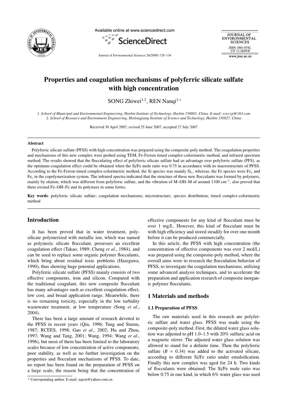 在这篇文章中, 采用复合聚合法制备了高浓度PFSS (有效成分的浓度超过2摩尔/ L),本文的总体目标是研究PFSS的絮凝行为,采用一些先进的分析技术探讨混凝机理,以及加速复合无机高分子絮凝剂的制备和应用研究。