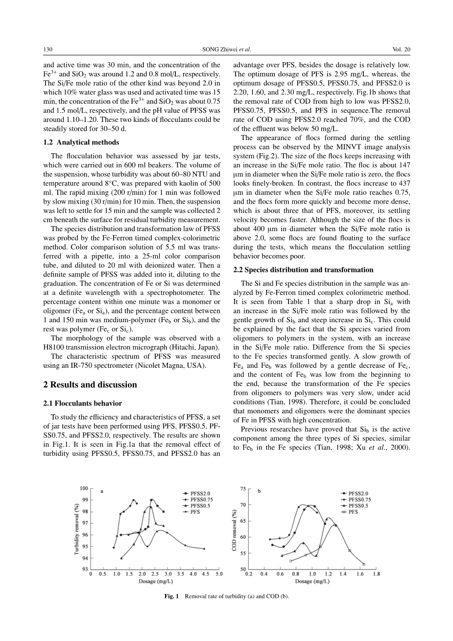 已有研究证明,Sib是三种类型Si物种中的活性成分,类似于Feb在Fe物种一样(Tian, 1998;b b 徐等,2000)。在这个研究中,可以得出结论,Si的浓度对铁物种的影响并不明显,但随着Si/Fe比的增加,Sib与Feb的百分含量增加,这与絮凝作用是一致的(表1)。这表明有效成分不仅是Feb,而且在复合PFSS中还有Sic。聚合硫酸铁可以增强絮凝效果。