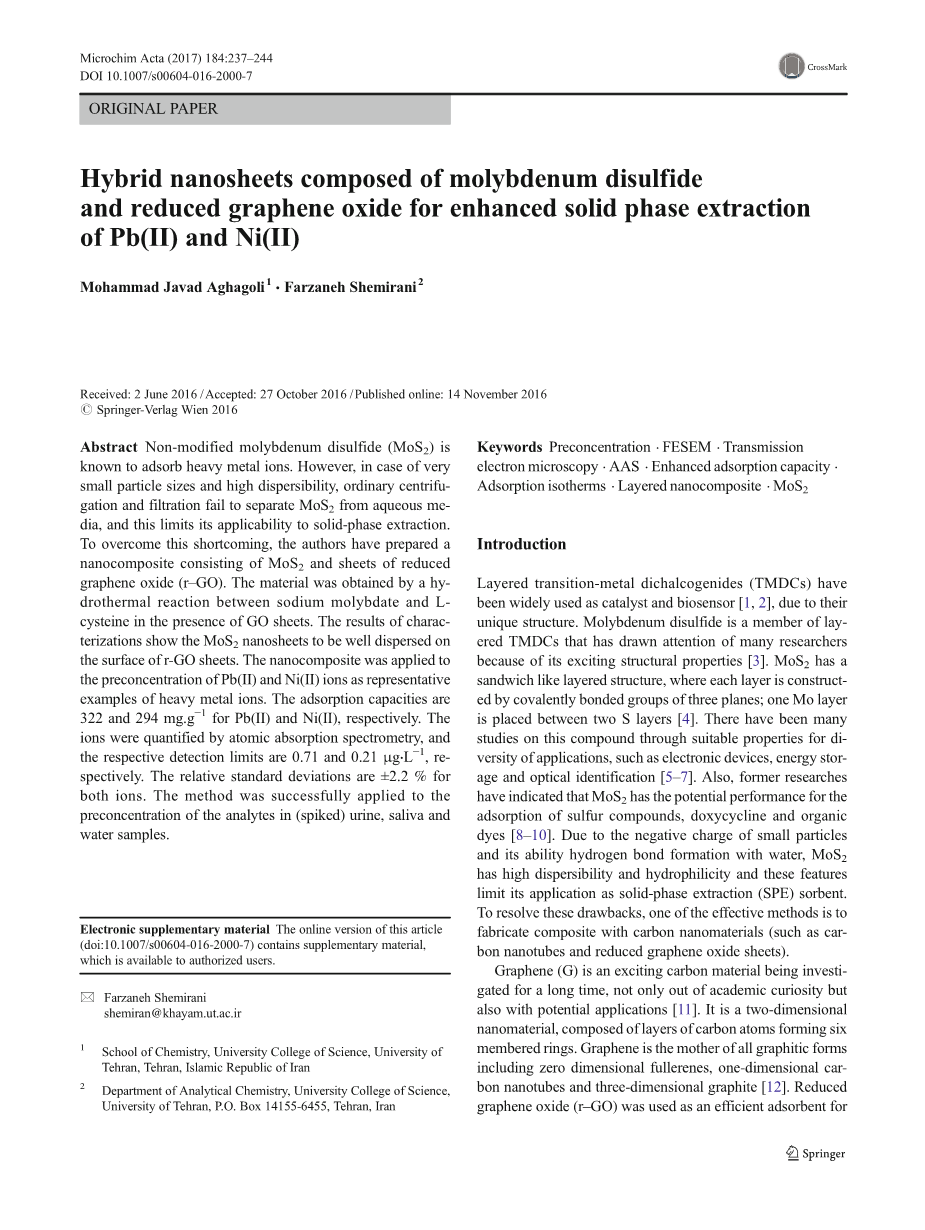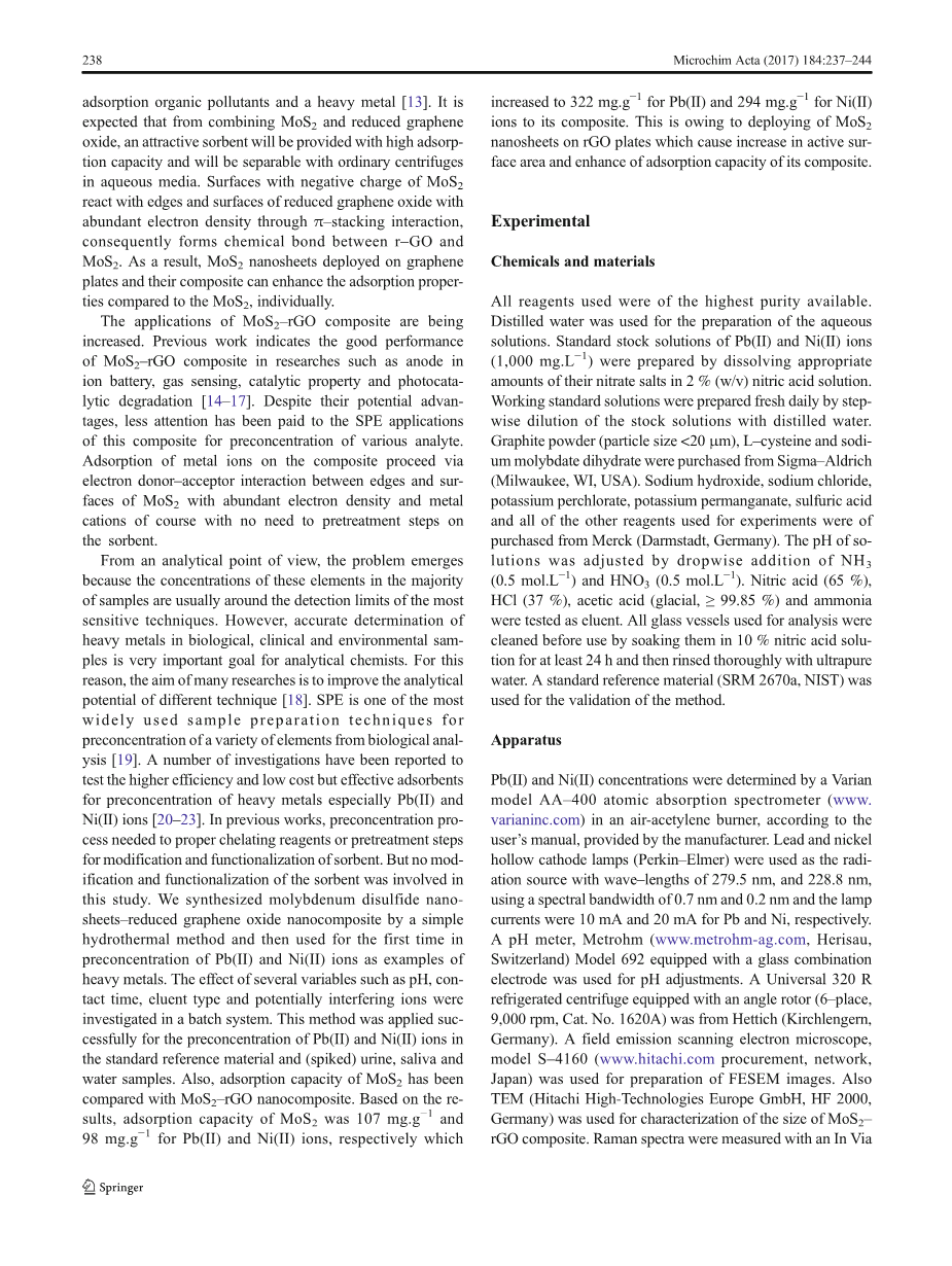 预浓缩;场发射扫描电子显微镜;透射电子显微镜;原子吸收光谱法;增强吸附能力;吸附等温线;层状纳米复合材料;二硫化钼