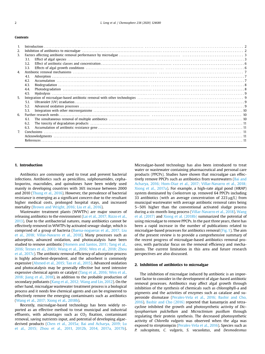 抗生素通常用于治疗和预防细菌感染。抗生素如青霉素类、磺胺类、头孢菌素类、大环内酯类和喹诺酮类主要在发展中国家广泛使用,在2000年至2010年期间增加了36% 。然而,由于导致医疗费用增加、住院时间延长和死亡率增加,细菌耐药性的流行正成为一个重大问题。污水处理厂是向环境释放抗生素的主要来源。由于抗菌性质,许多抗生素不能通过污水处理厂的活性污泥有效地去除,这是一组细菌。许多过程,如吸附,高级氧化,和光催化已被研究去除抗生素。吸附过程的抗生素去除效率与吸附剂高度相关,吸附剂通常价格昂贵。高级氧化和光催化通常有效,但需要密集昂贵的化学试剂或催化剂,除了可能产生的二次污染物。另一方面,微藻废水处理过程是一个生物过程,它需要很少的化学试剂,可以设计有效地去除新兴污染物,如抗生素。